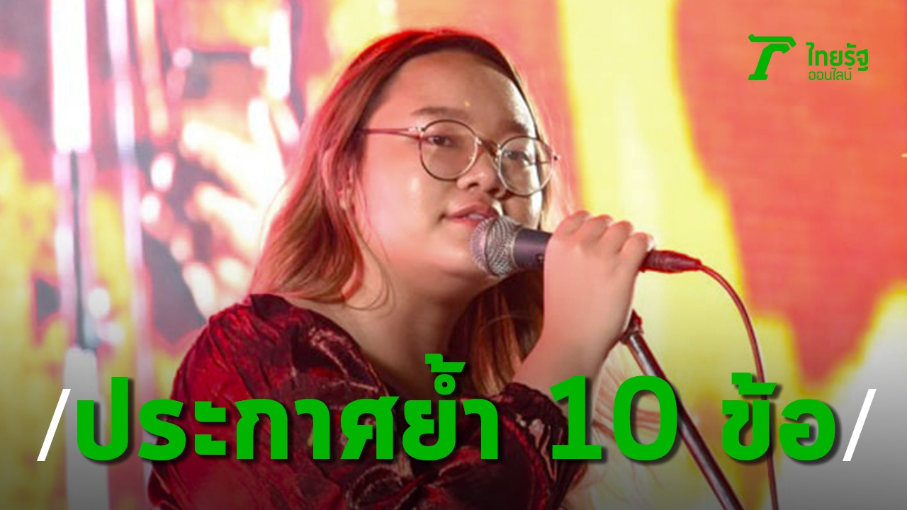 ล่วงเข้าสู่วันใหม่ “รุ้ง ปนัสยา” แกนนำหลักของกลุ่มแนวร่วมธรรมศาสตร์และการชุมนุม ขึ้นเวทีสนามหลวงปราศรัยย้ำจุดยืน 10 ข้อเรียกร้องปฏิรูปสถาบัน