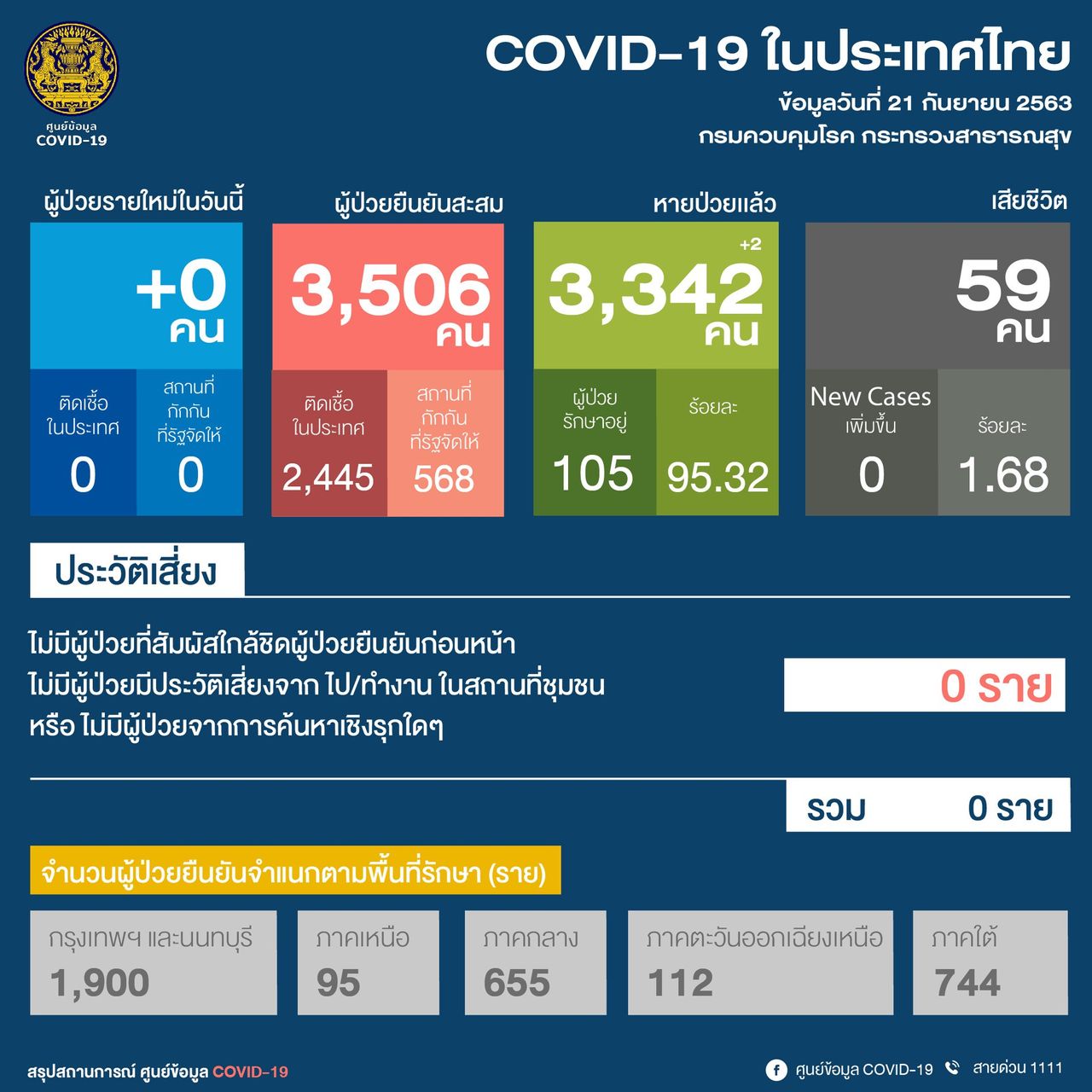 ศูนย์ข้อมูล COVID-19 รายงาน สถานการณ์โควิด-19 วันนี้ ไม่พบผู้ติดเชื้อ รักษาหายเพิ่มอีก 2 ราย ไม่พบผู้ติดเชื้อภายในประเทศ รวมยอดผู้ป่วยสะสม 3,506 ราย