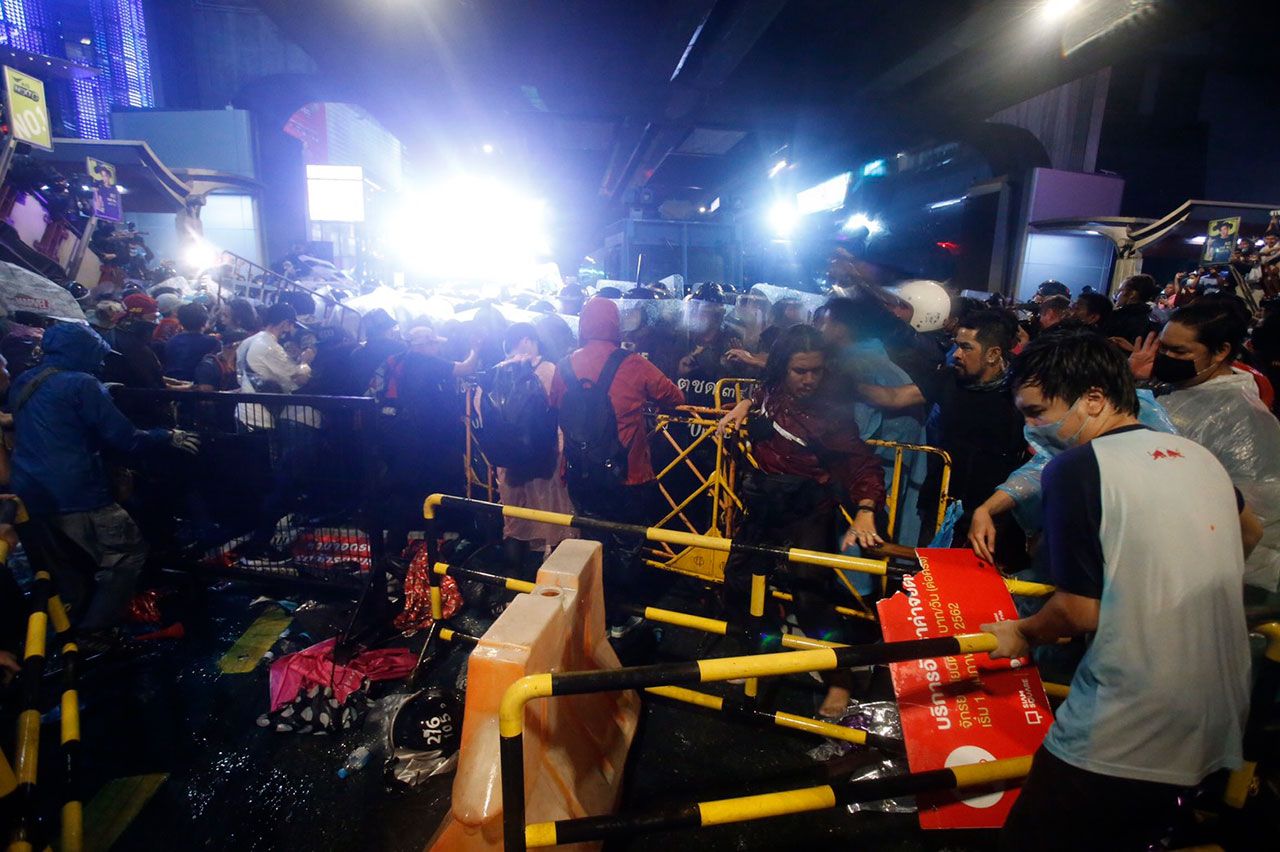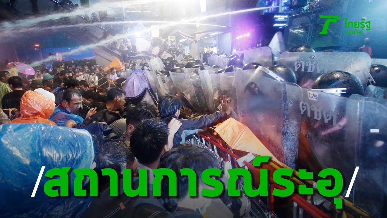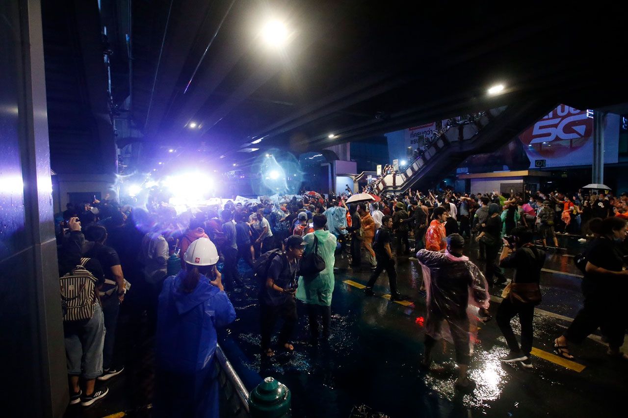 เจ้าหน้าที่ควบคุมฝูงชน เสริมกำลังตั้งแนวอีกครั้ง พร้อมเดินประชิดกลุ่มผู้ชุมนุมบริเวณใต้ BTS สยาม จนกลุ่มผู้ชุมนุมถอยร่นออกทั้งหมด