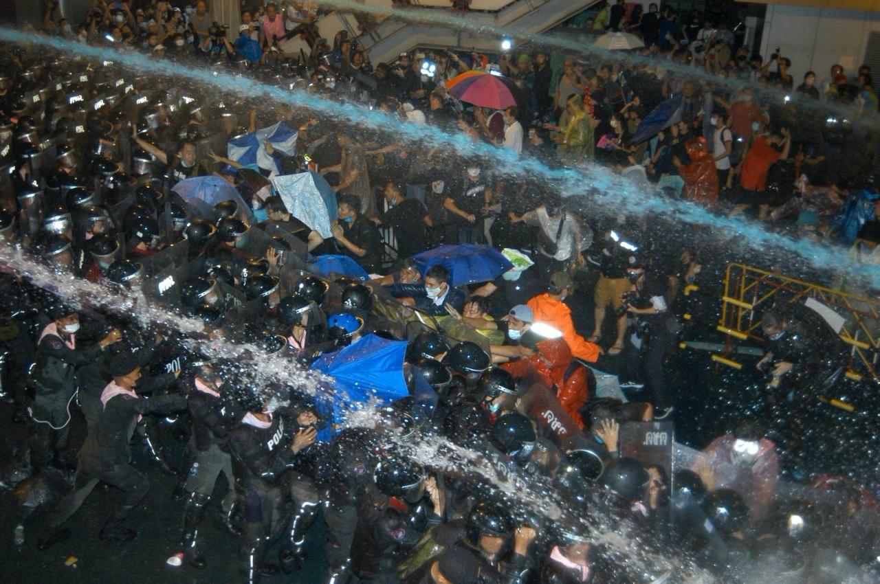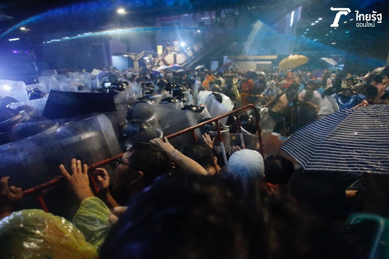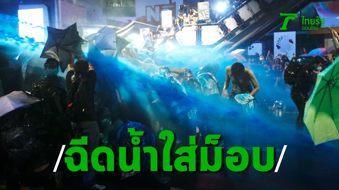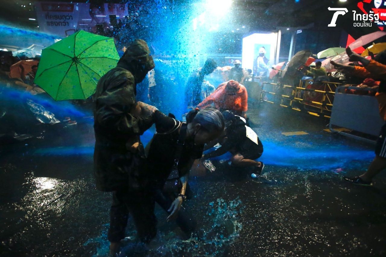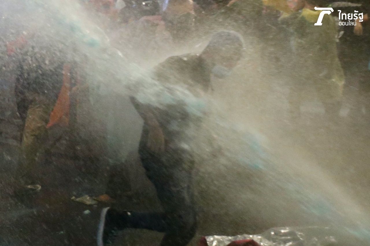 เมื่อเวลา 18.50 น. วันที่ 16 ต.ค. 2563 มีรายงานว่า ตำรวจเริ่มฉีดน้ำผสมสีน้ำเงินใส่ผู้ชุมนุม ทำให้ผู้ชุมนุมรวมตัวกันพยายามดันแนวตำรวจที่อยู่หน้าสุดเอาไว้ บางคนพยายามแย่งหมวกกันน็อกและโล่กระบองจากตำรวจ รวมทั้งมีการนำแผงรั้วเหล็กมาดันตำรวจ