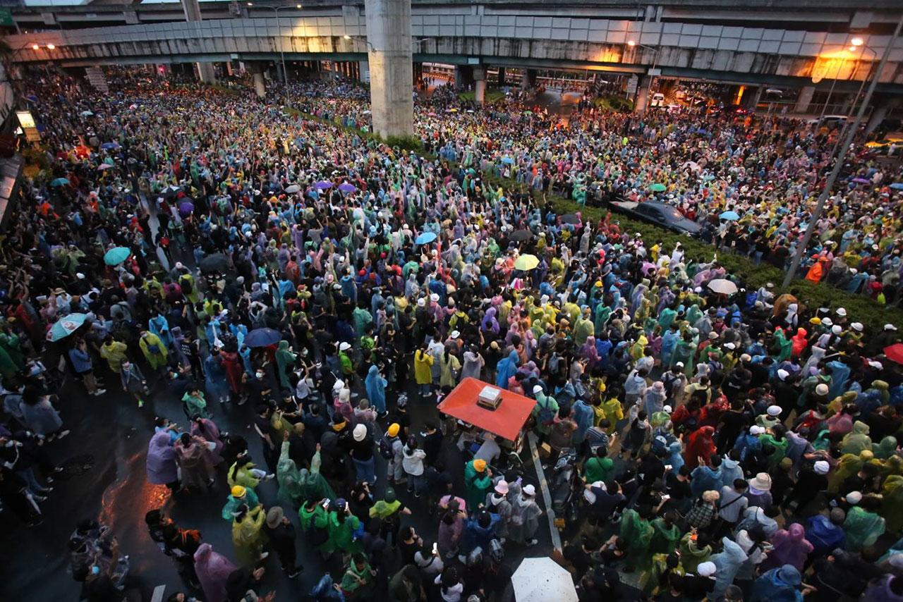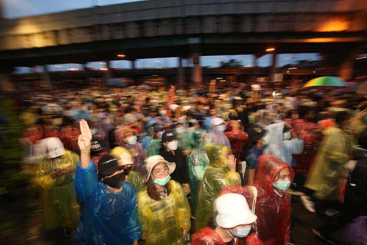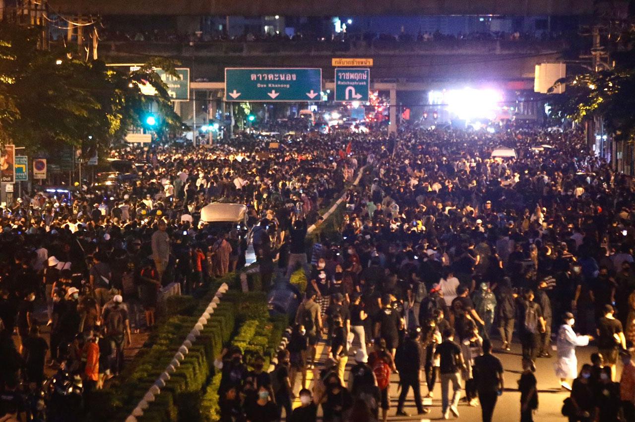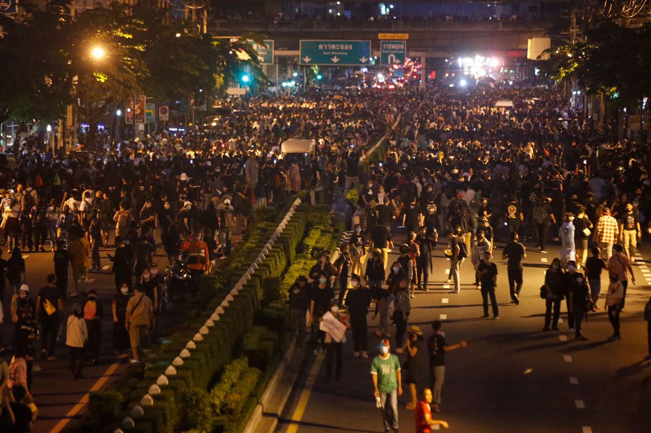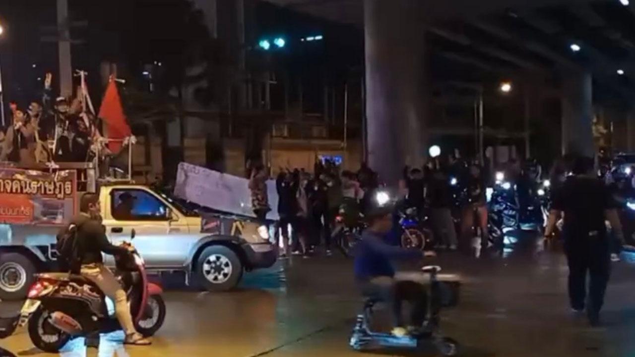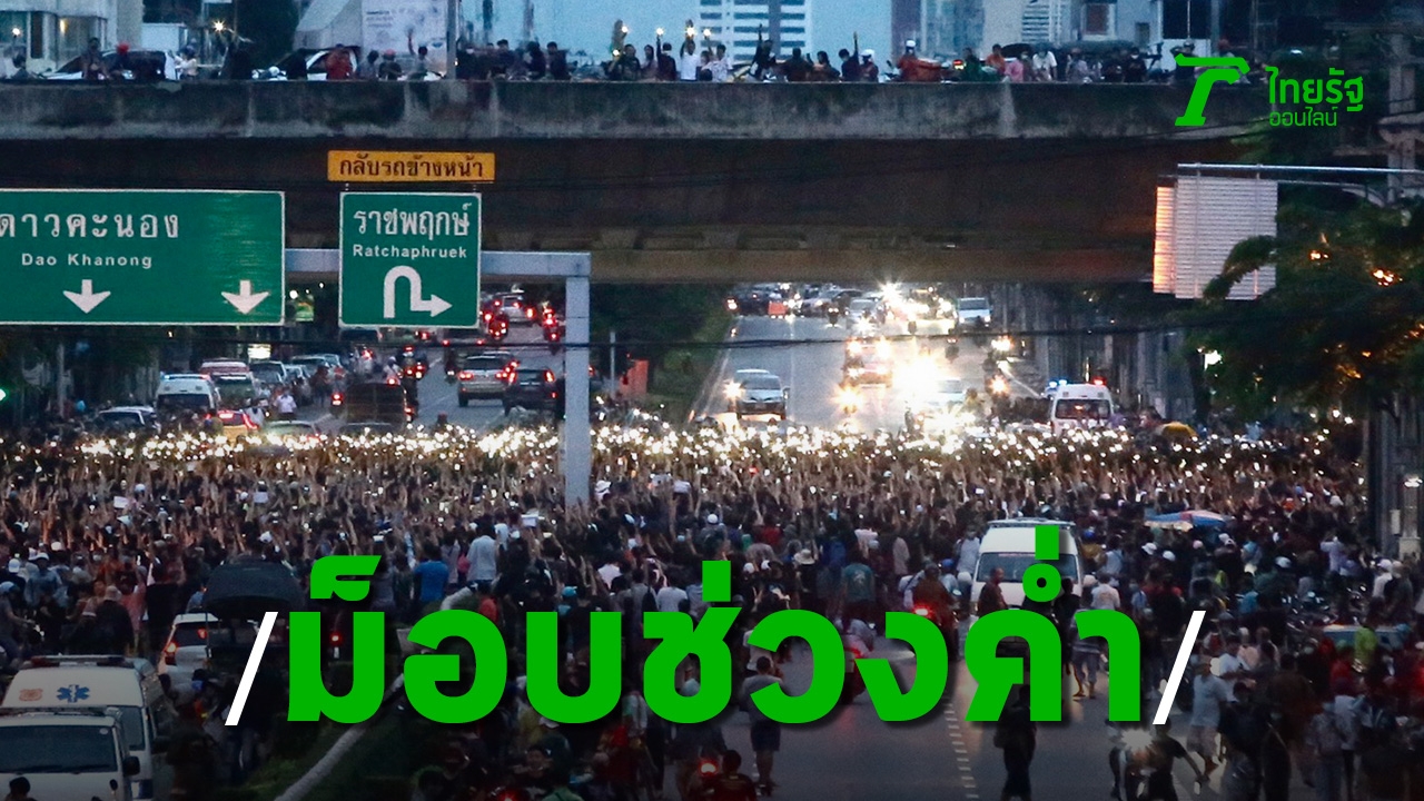 บรรยากาศการชุมนุมช่วงค่ำ 3 จุดใหญ่ ห้าแยกลาดพร้าว แยกตากสิน บางนา ขณะที่ผู้ชุมนุมบางส่วนทยอยแยกย้าย หลังร่วมร้องเพลงชาติ แสดงสัญลักษณ์ ชู 3 นิ้ว