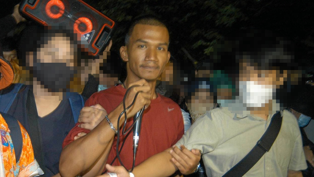 นายภาณุพงศ์ จาดนอกหรือ “ไมค์ ระยอง” ปราศรัยที่ ม.รามคำแหงก่อนถูกชุดสืบสวน กก.1 บก.ป.และชุดสืบสวน กก.4 กก. สส.บก.น.4 ดักจับกุมที่ซอยรามฯ 53.