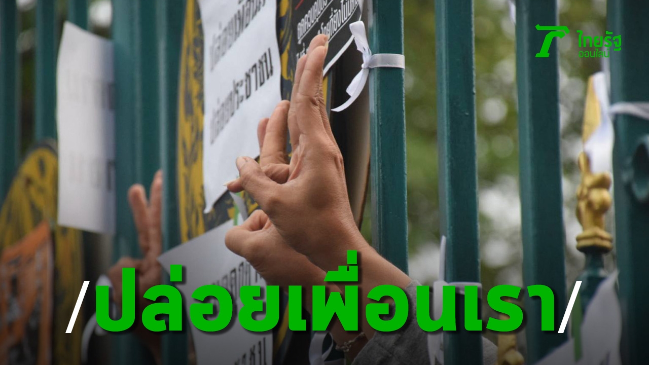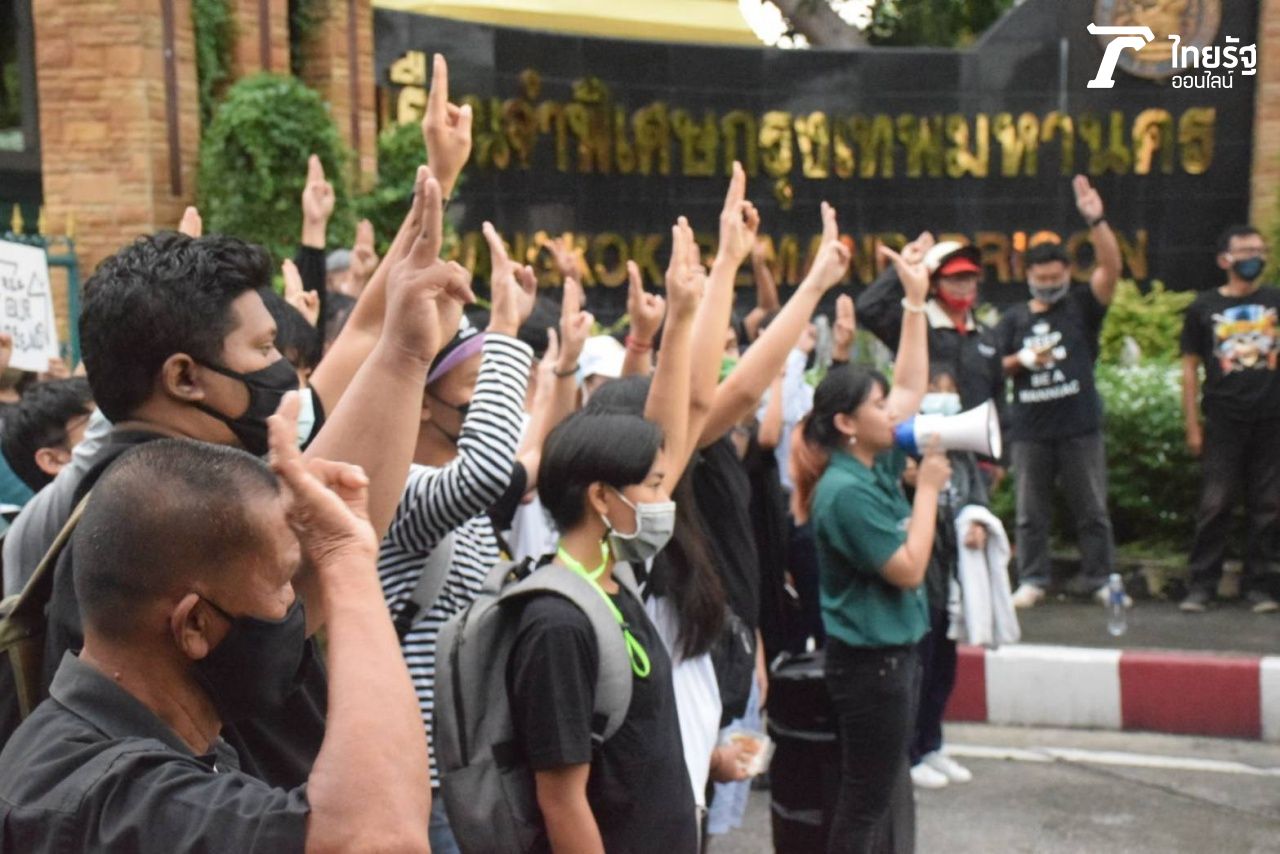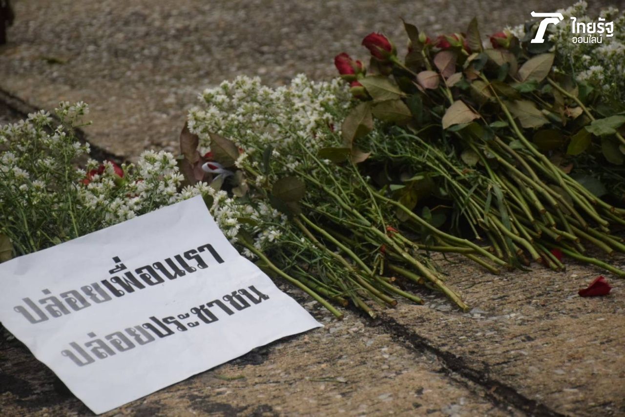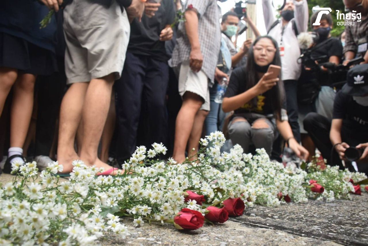 ผู้ชุมนุมร่วมร้องเพลงชาติ หลังวางกุหลาบหน้าเรือนจำพิเศษกรุงเทพ ก่อนเคลื่อนขบวนสมทบที่แยกเกษตร