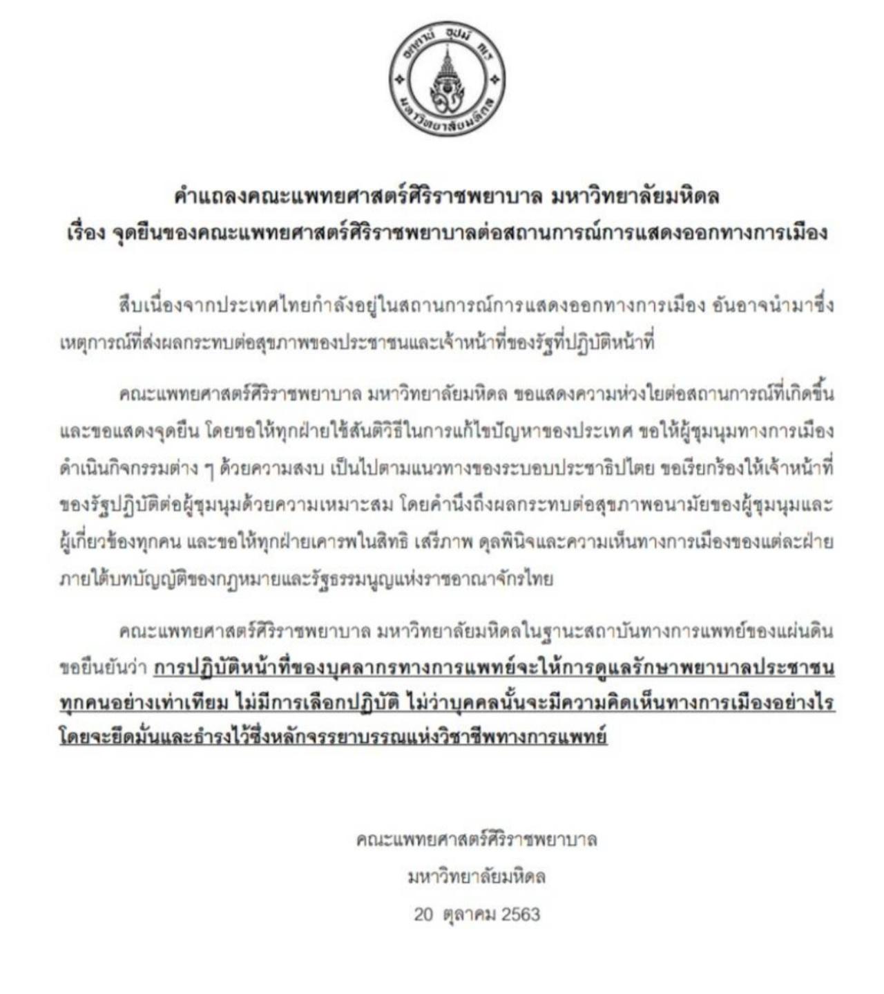 วันที่ 20 ต.ค. 2563 คณะแพทยศาสตร์ศิริราชพยาบาล มหาวิทยาลัยมหิดล ออกแถลงการณ์ แสดงจุดยืนเรียกร้องให้ทุกฝ่ายแสดงออกทางการเมืองอย่างสันติวิธี โดยมีเนื้อหาระบุว่า สืบเนื่องจากประเทศไทยกำลังอยู่ในสถานการณ์การแสดงออกทางการเมือง อันอาจนำมาซึ่งเหตุการณ์ที่ส่งผลกระทบต่อสุขภาพของประชาชนและเจ้าหน้าที่ของรัฐที่ปฏิบัติหน้าที่