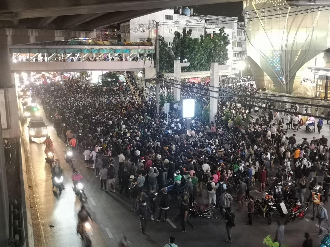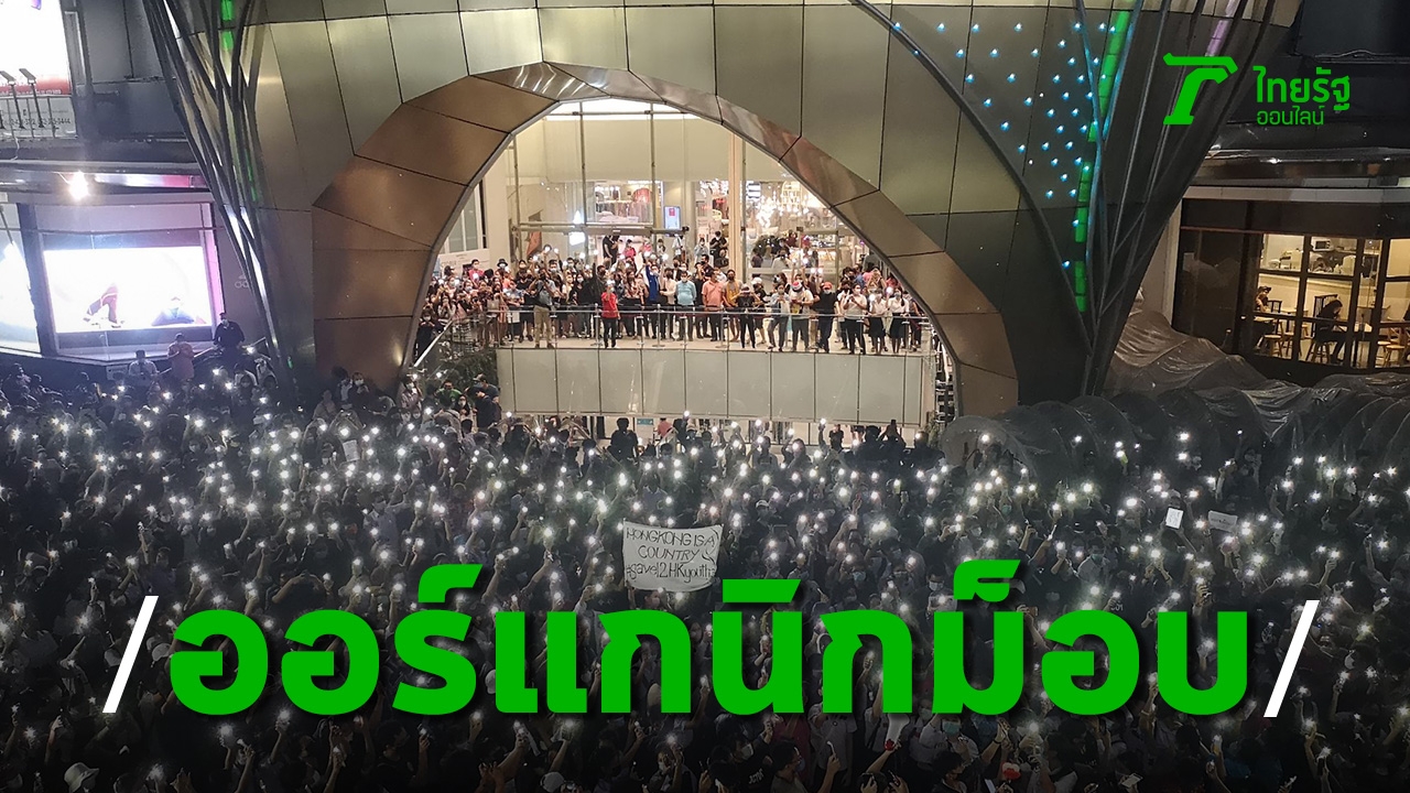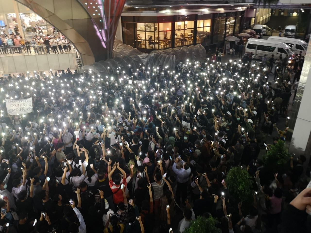 มวลชนเดินทางร่วมชุมนุม ชู 3 นิ้ว พร้อมแฟลชม็อบ แน่นหน้าห้างเซ็นทรัลปิ่นเกล้า โดยยังไม่มีการประกาศว่าจะยุติการชุมนุม