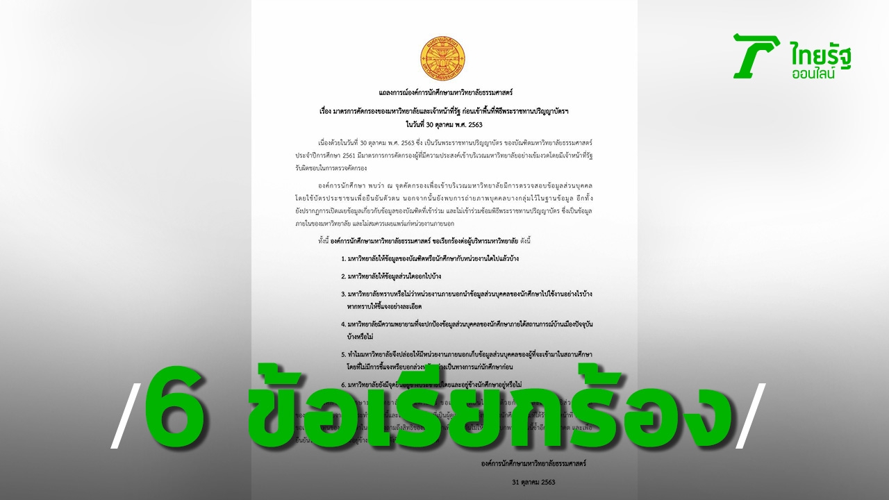 องค์การนักศึกษามหาวิทยาลัยธรรมศาสตร์ แถลงการณ์ 6 ข้อเรียกร้องต่อผู้บริหาร กรณีตั้งจุดคัดกรองตรวจสอบข้อมูลส่วนบุคคล