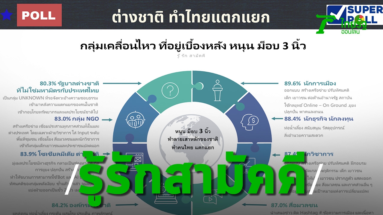 โพล ตอกย้ำ 88.9% หนุนคนไทย ควรช่วยจับตาต่างชาติ เคลื่อนไหวทำม็อบ 3 นิ้ว เยาวชนตกเป็นเหยื่อ ให้คนไทยแตกแยกรุนแรง ขณะ 88.3 เชื่อ มีองค์กรต่างชาติอยู่เบื้องหลัง ยันยึดหลักปฏิบัติ “รู้รักสามัคคี” แก้ไข