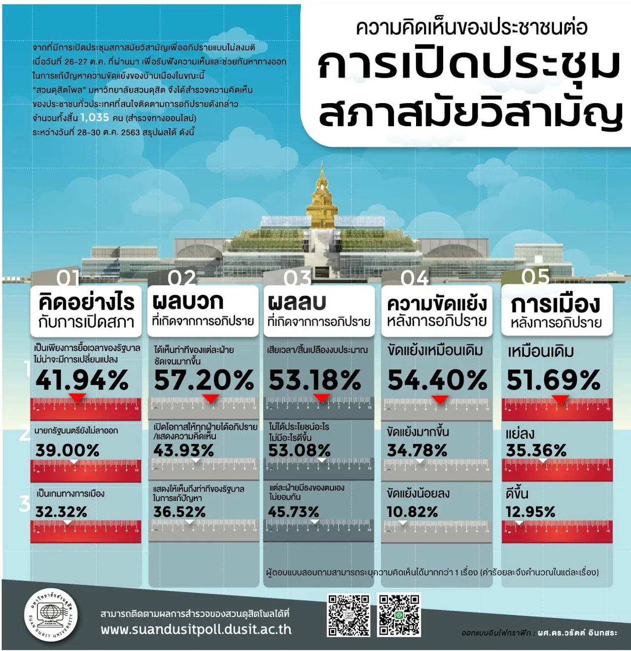 สวนดุสิตโพล ชี้ คนกว่า 51.69% มองการเมืองไทย หลังเปิดประชุมสภาสมัยวิสามัญ 26-27 ต.ค. ยังเหมือนเดิม ขณะส่วนใหญ่ร้อยละ 41.94 เห็นเป็นเพียงการยื้อเวลาของรบ. ขณะร้อยละ 57.20% ระบุ ได้เห็นท่าทีของแต่ละฝ่ายชัดขึ้น