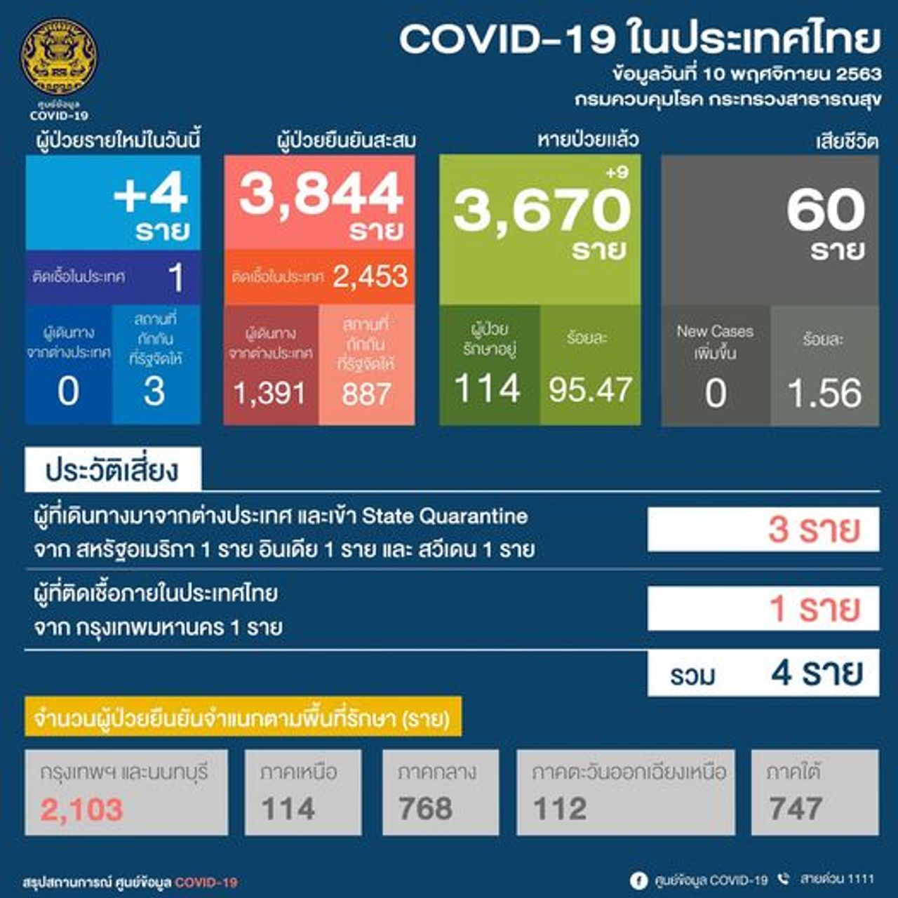 เมื่อเวลา 11.00 น. วันที่ 10 พ.ย. 2563 ผู้สื่อข่าวรายงานว่า ศูนย์ข้อมูล COVID-19 รายงานสถานการณ์ผู้ติดเชื้อโคโรนาไวรัส หรือ โควิด-19 ในประเทศไทย โดยมีรายงานดังนี้
