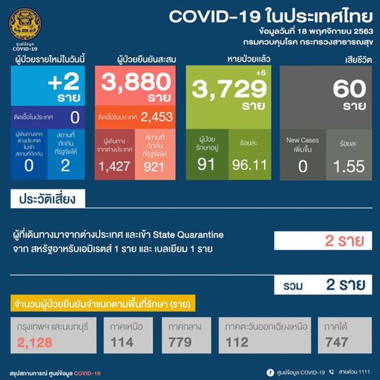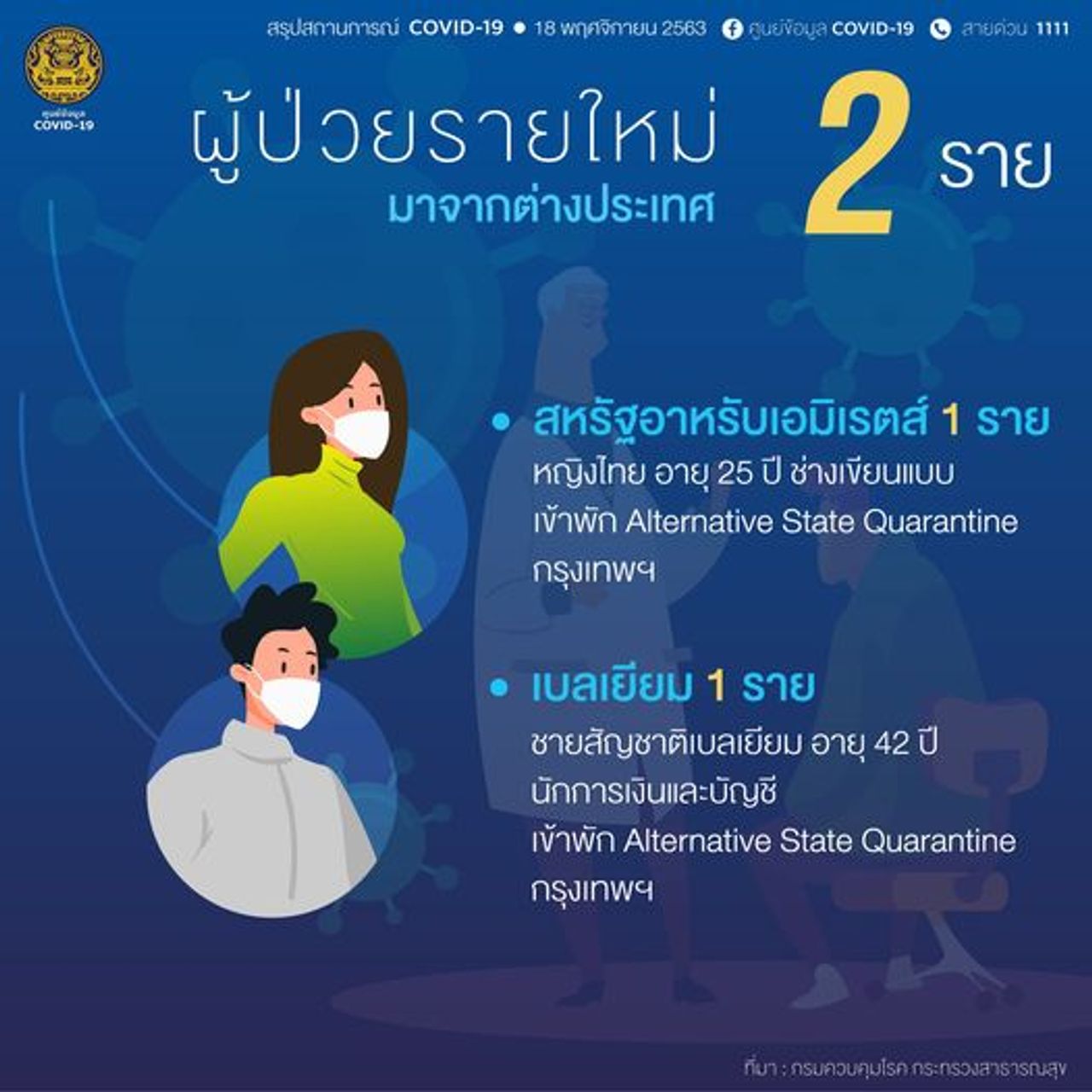 เมื่อเวลา 11.00 น. วันที่ 18 พ.ย. 2563 ผู้สื่อข่าวรายงานว่า ศูนย์ข้อมูล COVID-19 รายงานสถานการณ์ผู้ติดเชื้อโคโรนาไวรัส หรือ โควิด-19 ในประเทศไทย โดยมีรายงานดังนี้