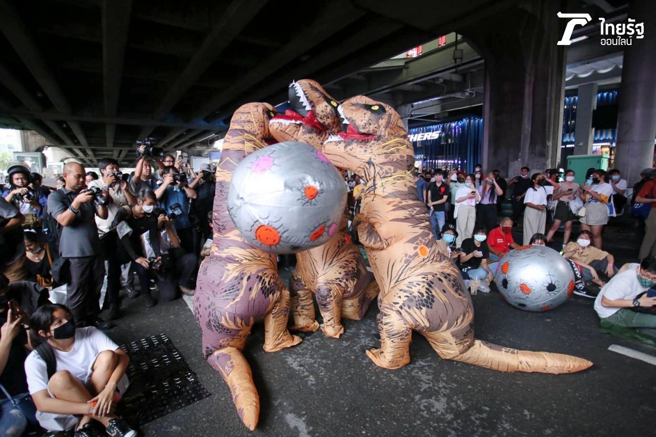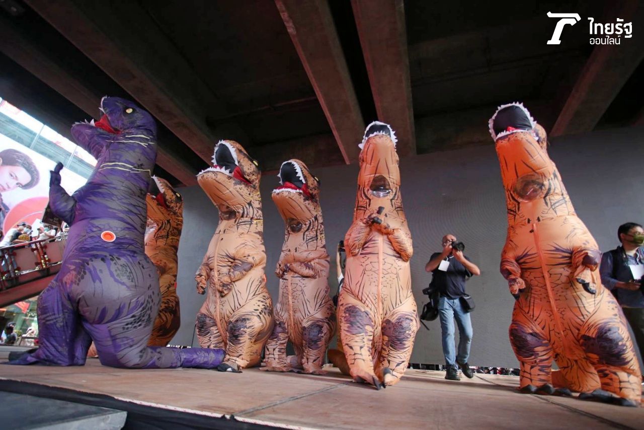 ประมวลภาพ "ม็อบนักเรียนเลว" เตรียมขึ้นปราศรัยในกิจกรรม "บ๊ายบายไดโนเสาร์" โดยมีมาสคอตไดโนเสาร์ และลูกบอลลมอุกกาบาต แสดงออกเชิงสัญลักษณ์
