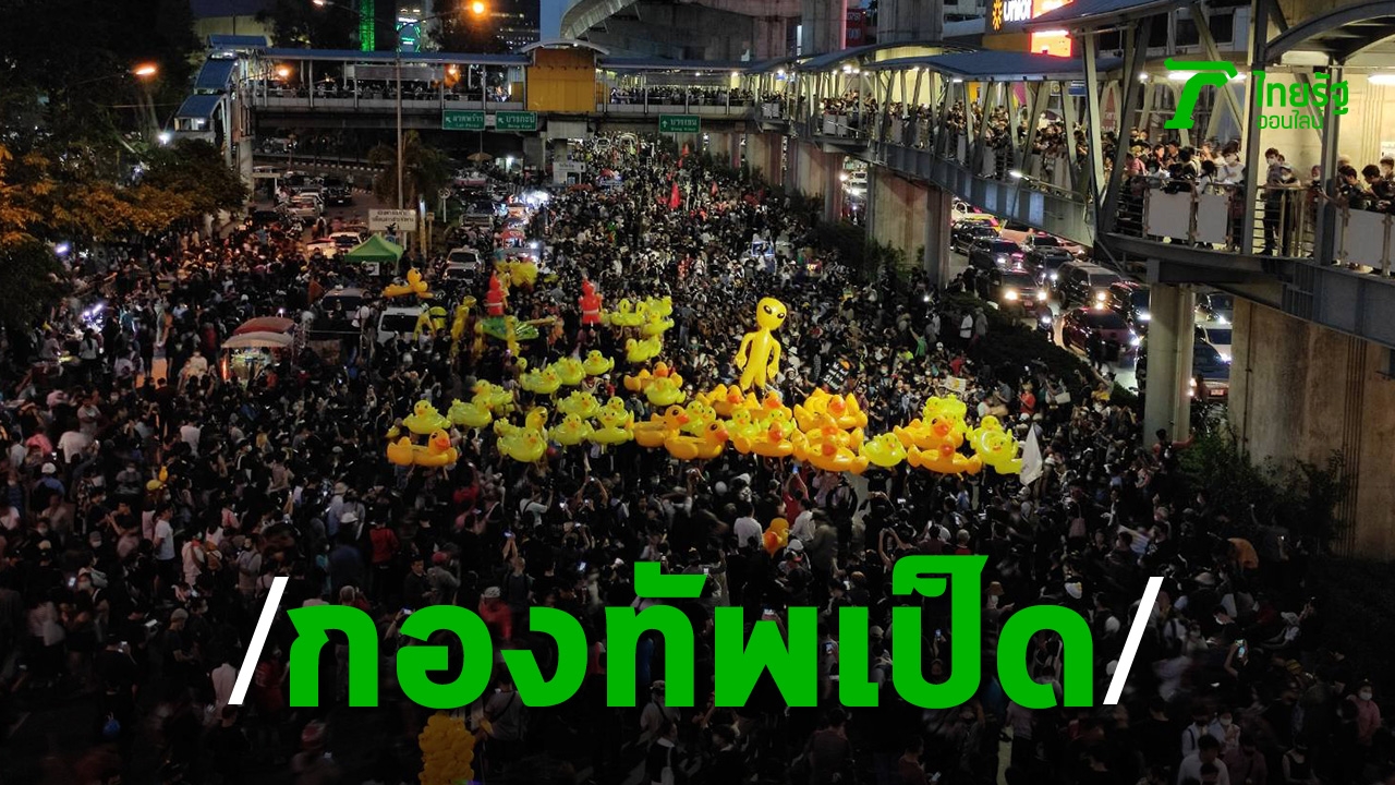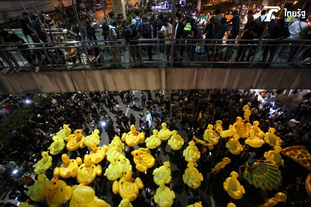 เมื่อเวลา 18.00 น. วันที่ 27 พ.ย. 2563 ผู้สื่อข่าวรายงานบรรยากาศการชุมนุมของม็อบราษฎรที่บริเวณห้าแยกลาดพร้าว ยังคงมีประชาชนเดินทางมาร่วมกิจกรรม ซ้อมต้านรัฐประหาร กันอย่างต่อเนื่อง โดยการชุมนุมในวันนี้ยังคงมีเป็ดเหลืองเป่าลมหลายสิบตัวเหมือนเช่นม็อบหลายครั้งในช่วงหลัง ซึ่งการใช้เป็ดเหลือง หรือเป็ดยางนั้น เริ่มนำมาใช้ในการชุมนุมที่หน้ารัฐสภาเมื่อวันที่ 17 พ.ย. 2563 ซึ่งวันนั้นผู้ชุมนุมได้ใช้เป็ดเหล่านี้ป้องกันตัวเองจากรถฉีดน้ำแรงดันสูงของเจ้าหน้าที่ โดยยังมีตุ๊กตาเอเลี่ยน และตุ๊กตาเป่าลมอีกหลายชนิด รวมถึงการผูกโบขาวต้านเผด็จการ ซึ่งสิ่งเหล่านี้เป็นการแสดงออกเชิงสัญลักษณ์ที่เป็นการชุมนุมโดยสันติ นอกจากนี้ ผู้เข้าร่วมชุมนุมที่อายุต่ำกว่า 18 ปี ก็จะมีการติดแท็กที่ข้อมือสีชมพูและสีส้มด้วย