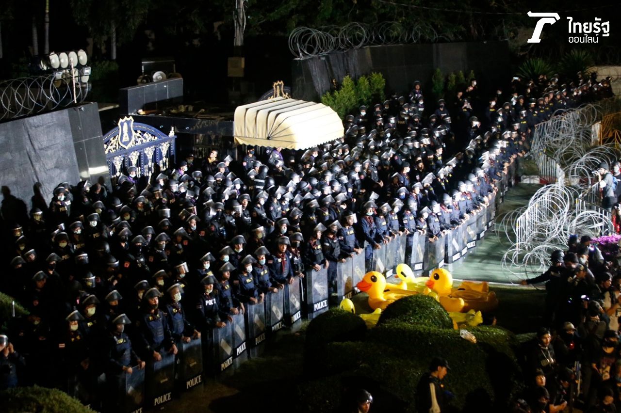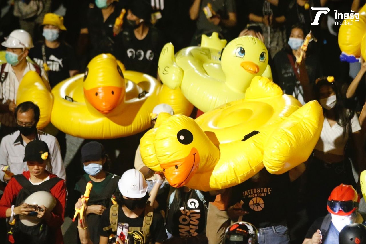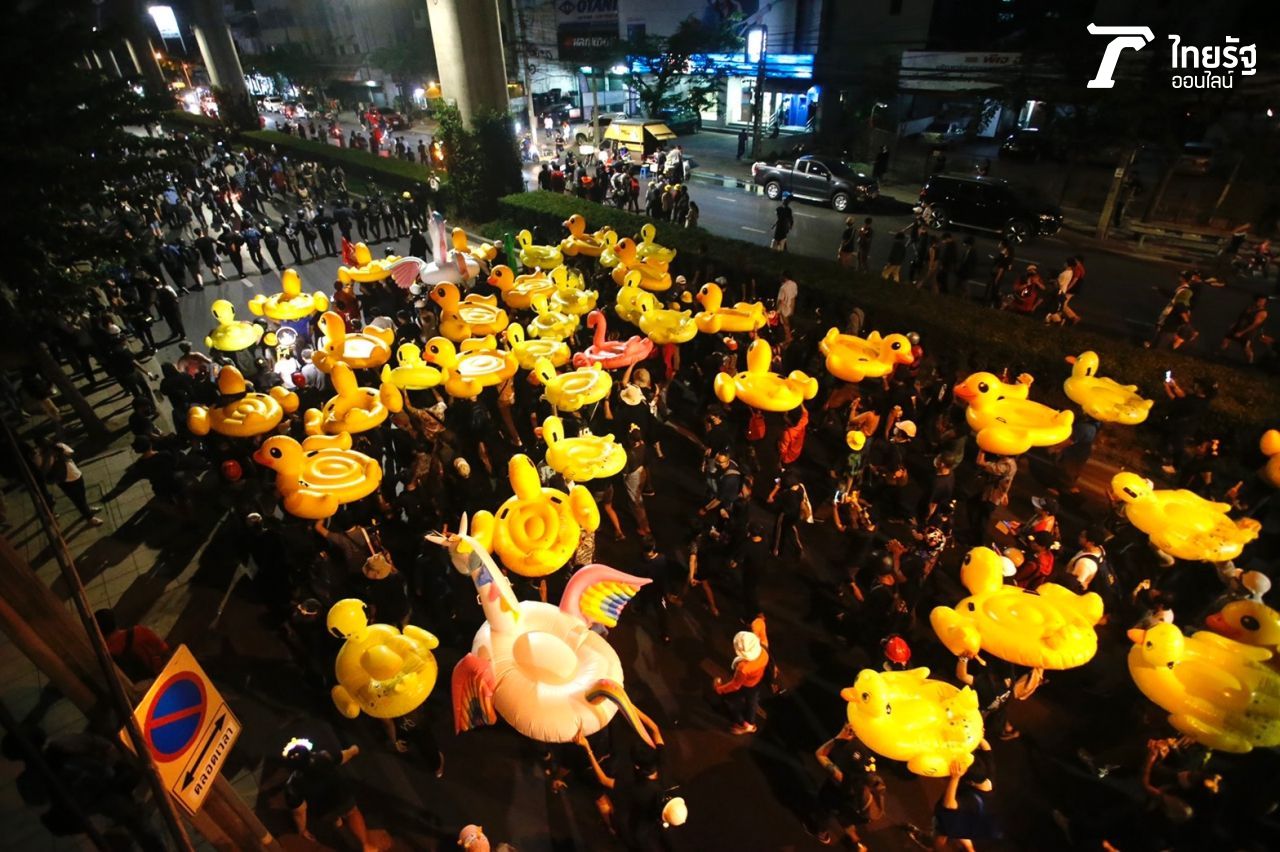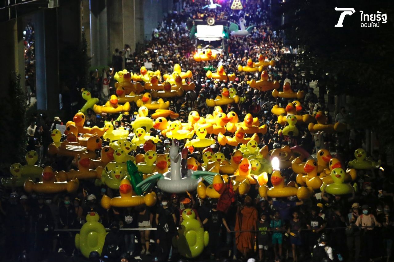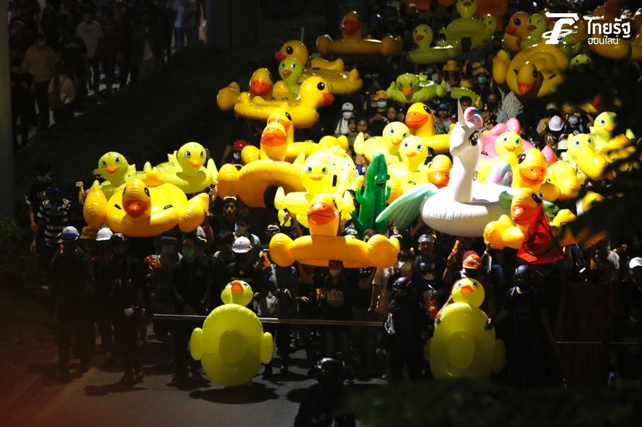 เมื่อเวลา 18.20 น. วันที่ 29 พ.ย. 2563 ผู้สื่อข่าวรายงานบรรยากาศการเคลื่อนขบวนของประชาชนที่เคลื่อนออกจากหน้าสถานีดับเพลิงบางเขน เดินเท้ามาพร้อมรถติดเครื่องขยายเสียง ซึ่งขบวนนำหน้าด้วยกร์ดของม็อบ ต่อด้วยขบวนเป็ดยางเป่าลมสีเหลือง รวมถึงตุ๊กตาเป่าลมต่างๆ ที่ผู้ชุมนุมกลุ่มราษฎรนำมาเป็นการแสดงออกเชิงสัญลักษณ์ว่าชุมนุมโดยสงบ สันติ และปราศจากอาวุธ และขณะเดินมาช่วงหนึ่งมีการเปิดไฟแฟลชจากโทรศัพท์มือถือด้วย อีกประมาณ 200-300 เมตร จะถึงหน้าประตูกรมทหารราบที่ 11 มหาดเล็กราชวัลลภรักษาพระองค์ ในพระบาทสมเด็จพระวชิรเกล้าเจ้าอยู่หัว ซึ่งในจุดนี้มีเจ้าหน้าที่ตรึงกำลัง
