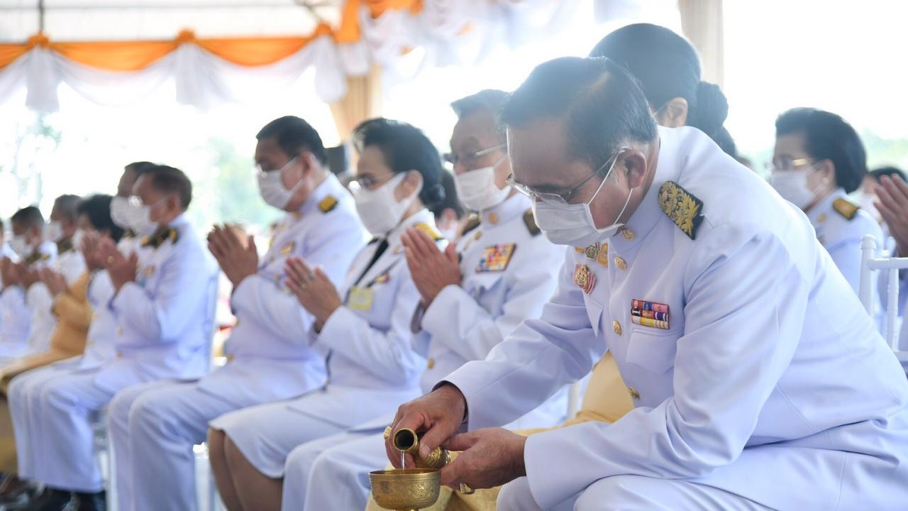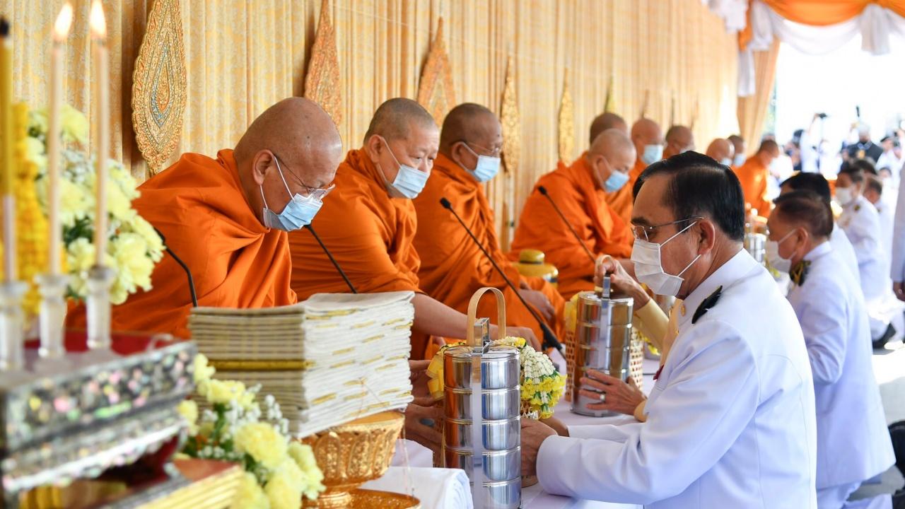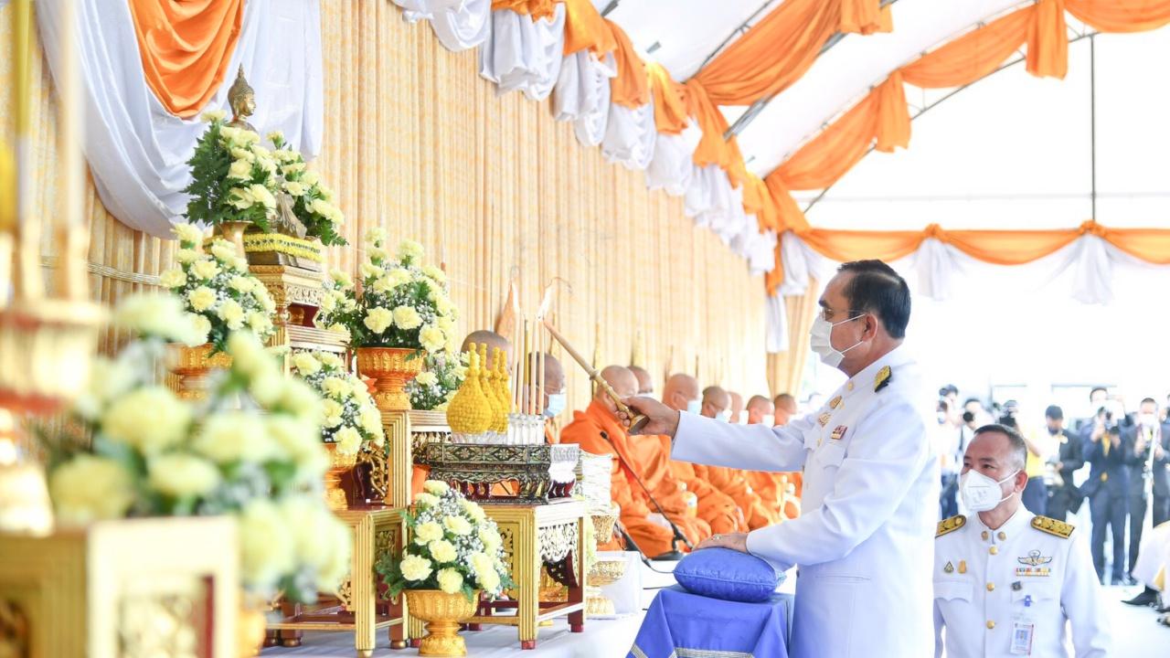 เมื่อนายกรัฐมนตรีและภริยา เดินทางถึงปะรำพิธีบริเวณท้องสนามหลวง พระสงฆ์จำนวน 10 รูป ขึ้นนั่งอาสน์สงฆ์ นายกรัฐมนตรีจุดธูปเทียนบูชาพระรัตนตรัย จุดธูปเทียนเครื่องทองน้อยหน้าพระบรมฉายาลักษณ์พระบาทสมเด็จพระชนกาธิเบศร มหาภูมิพลอดุลยเดชมหาราช บรมนาถบพิตร เจ้าหน้าที่อาราธนาศีล พระสงฆ์ให้ศีล จบ สวดพระพุทธมนต์