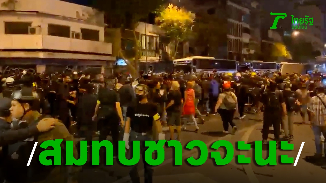 เวลา 21.15 น. เจ้าหน้าที่ตำรวจเริ่มถอยร่นลง แม้สถานการณ์จะไม่เกิดความวุ่นวาย แต่การ์ดของม็อบก็มีการสร้างแนวป้องกัน รวมถึงมีการยืนคล้องแขนเป็นกำแพงมนุษย์ไว้ด้วย