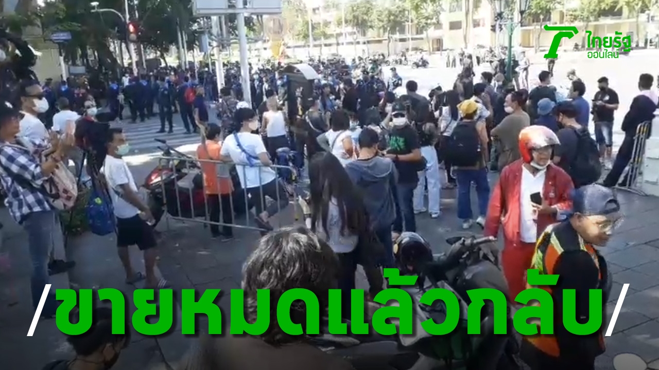 แต่หลังจากเปิดจำหน่ายได้ไม่ถึง 1 ชั่วโมง เวลา 14.00 น. เจ้าหน้าที่ตำรวจได้ปฏิบัติการกระชับพื้นที่อีกครั้ง โดยตั้งแนวแถวตั้งแต่บริเวณอนุสาวรีย์ประชาธิปไตย ก่อนจะวิ่งขับไล่กลุ่มผู้ชุมนุมให้สลายการชุมนุมและยกเลิกการขายกุ้ง เนื่องจากการกระทำดังกล่าว เป็นการฝ่าฝืน พ.ร.ก.ฉุกเฉิน ที่ออกคำสั่งห้ามชุมนุม ทำกิจกรรม หรือมั่วสุม ที่มีความเสี่ยงต่อการแพร่ระบาดของเชื้อโควิด-19 ผู้ฝ่าฝืนต้องรับโทษจำคุกไม่เกิน 2 ปี ปรับ 4 หมื่น หรือทั้งจำทั้งปรับ แต่หากจะจัดงานต้องขออนุญาตผู้ว่าราชการจังหวัด