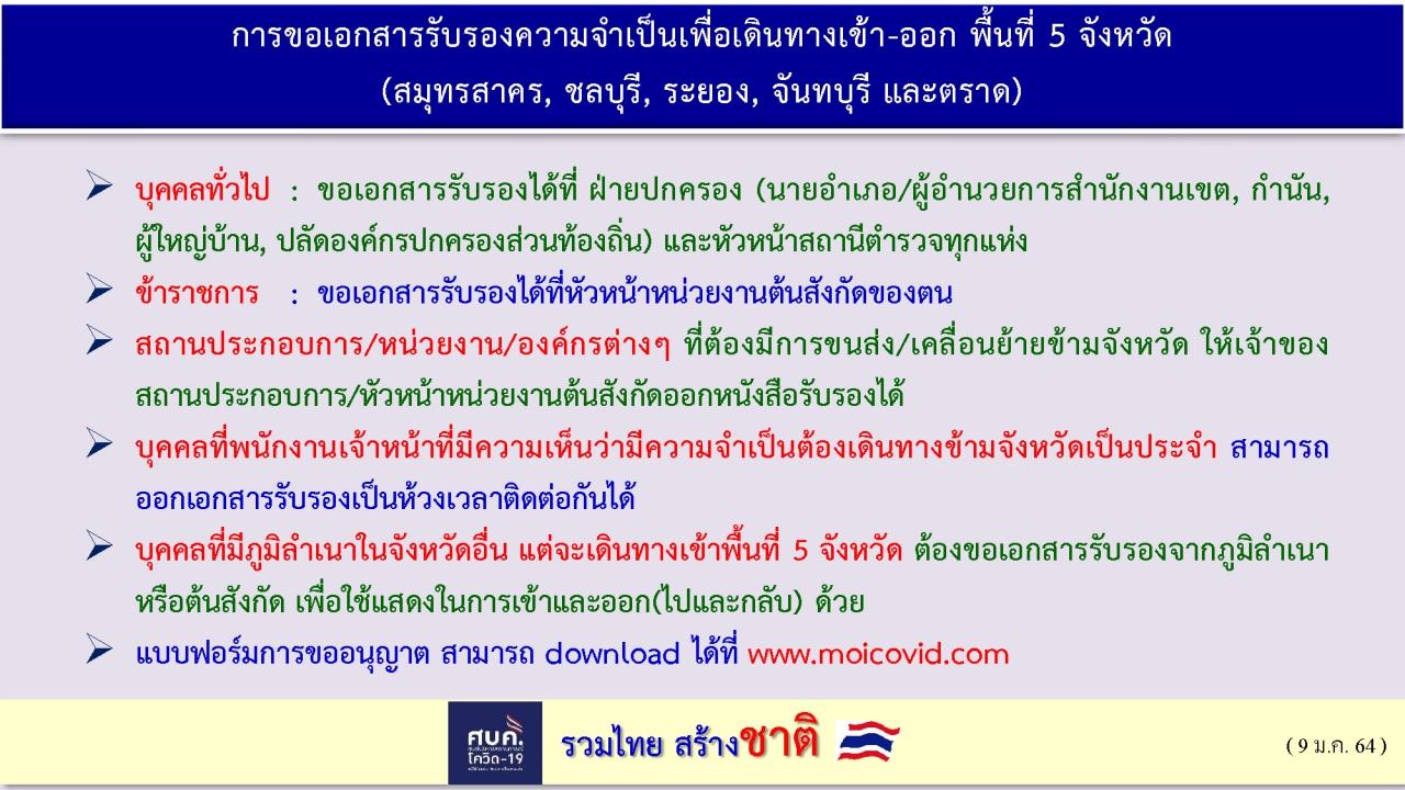 ทั้งนี้ โฆษก ศบค. ยังระบุถึงการขอเอกสารรับรองความจำเป็นเพื่อเดินทางเข้า-ออกพื้นที่ควบคุมสูงสุดและเข้มงวด 5 จังหวัด (สมุทรสาคร ชลบุรี ระยอง จันทบุรี และตราด)