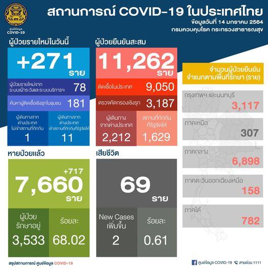 โควิด-19 วันนี้ พบผู้ติดเชื้อเพิ่ม 271 ราย ติดเชื้อในประเทศ 259 ราย รวมผู้ป่วยสะสม 11,262 ราย ผู้เสียชีวิตเพิ่มอีก 2 ราย รวมเป็น 69 ศพ รักษาหายเพิ่ม 717 ราย