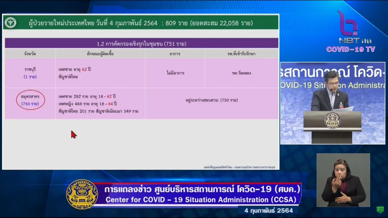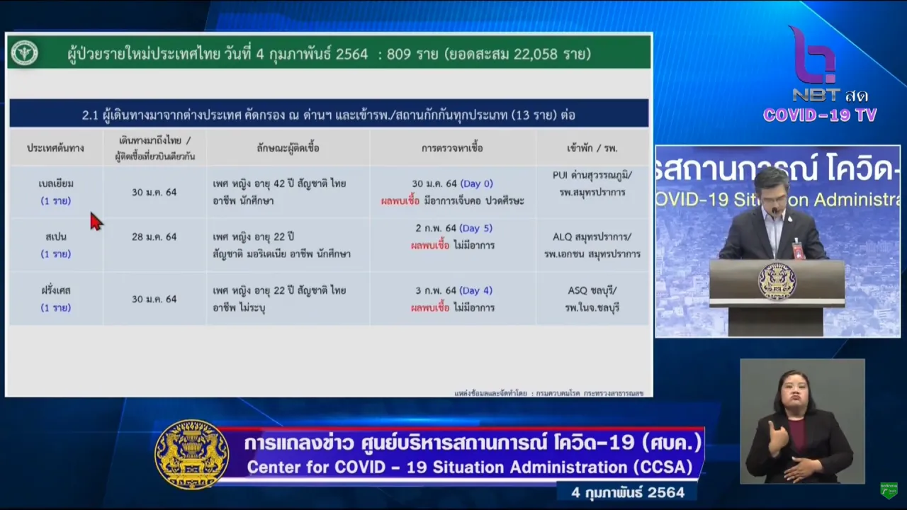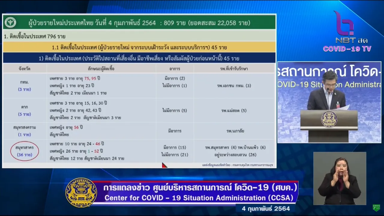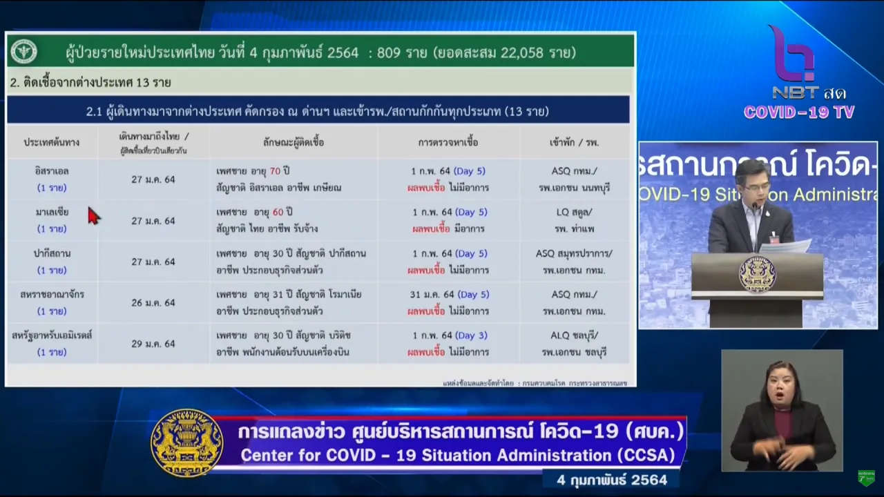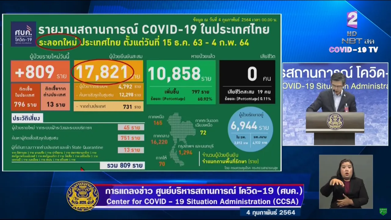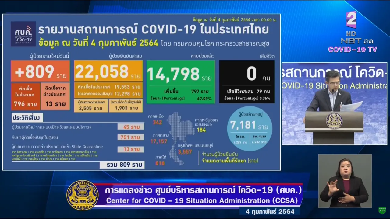 ศบค. แถลงสถานการณ์โควิดวันนี้ 4 ก.พ. 64 พบผู้ติดเชื้อเพิ่ม 809 ราย ยอดป่วยยืนยันสะสม 22,058 ราย รักษาหายอีก 797 ราย