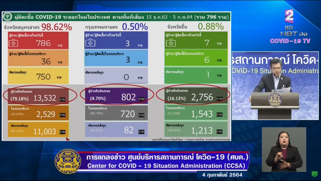 เมื่อเวลา 11.30 น. วันที่ 4 ก.พ. 2564 นายแพทย์ทวีศิลป์ วิษณุโยธิน โฆษกศูนย์บริหารสถานการณ์การแพร่ระบาดของโรคติดเชื้อไวรัสโคโรนา 2019 (โควิด-19) หรือ ศบค. รายงานสถานการณ์ผู้ติดเชื้อโควิด-19 ในประเทศไทย ดังนี้