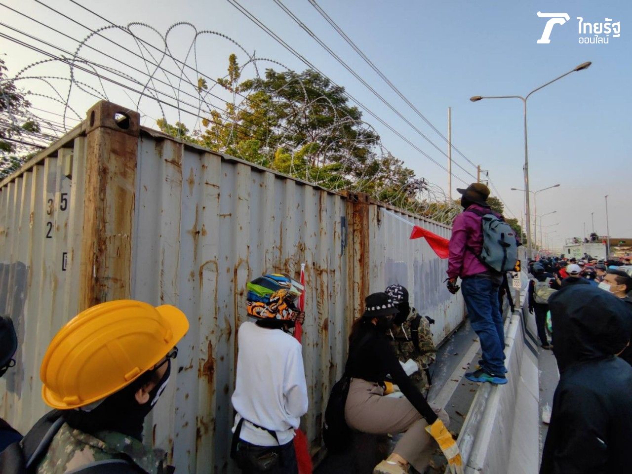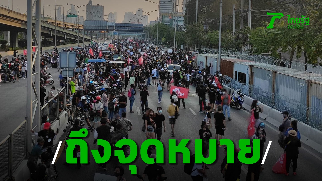 ผู้ชุมนุมทยอยเดินถึง กรมทหารราบที่ 1 ถ.วิภาวดี ซึ่งเป็นจุดหมายของการชุมนุมวันนี้ ติดแนวตู้คอนเทนเนอร์ และรั้วลวดหนามของเจ้าหน้าที่