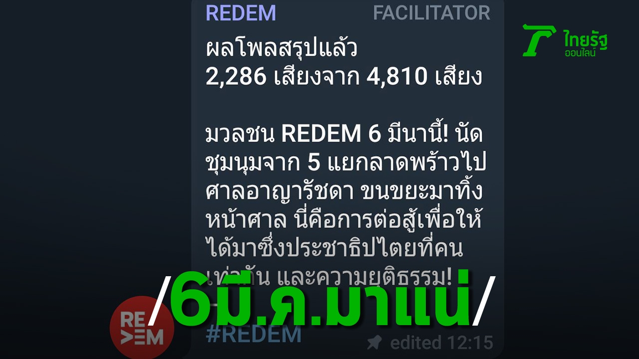 กลุ่ม REDEM ยืนยัน ชุมนุม 6 มี.ค.ที่ห้าแยกลาดพร้าว ก่อนเดินขบวนไปศาลอาญารัชดา ระบุ จะมีการขนขยะมาหน้าศาล บอก นี่คือการต่อสู้เพื่อให้ได้มาซึ่งประชาธิปไตย