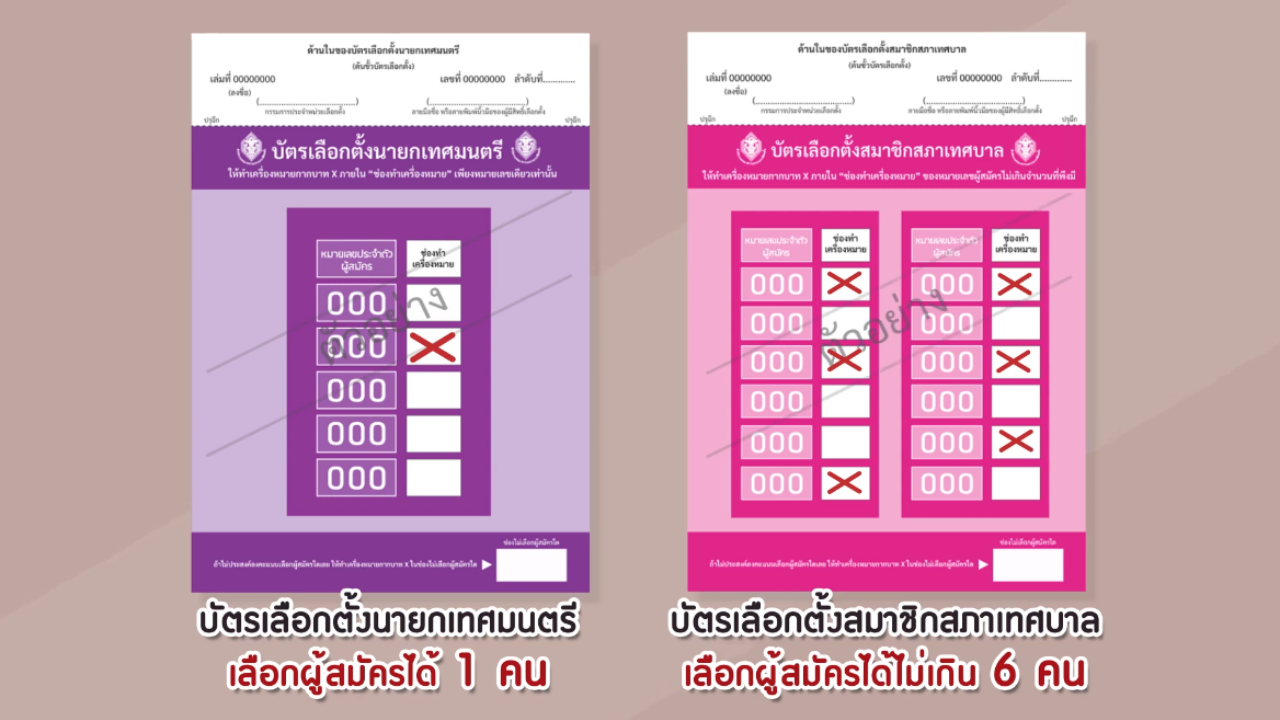 4. จากนั้นเข้าคูหา ทําเครื่องหมายกากบาท (X) ลงในช่องทําเครื่องหมาย โดยบัตรเลือกตั้งนายกเทศมนตรี เลือกผู้สมัครได้เพียงหนึ่งคน และบัตรเลือกตั้งสมาชิกสภาเทศบาลเลือกผู้สมัครได้จํานวน 6 คน หากไม่ต้องการ เลือกผู้สมัครผู้ใด ให้ทําเครื่องหมายกากบาท (X) ในช่องไม่เลือกผู้สมัครผู้ใด เสร็จแล้วพับบัตรเลือกตั้ง