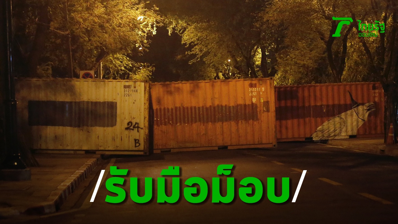 เจ้าหน้าที่ตำรวจนำตู้คอนเทนเนอร์มาตั้ง ตรงข้ามทำเนียบฯ รับมือม็อบทะลุฟ้าทำกิจกรรม 30 มี.ค. ช่วงที่คณะรัฐมนตรีชุดใหม่ถ่ายรูปหมู่