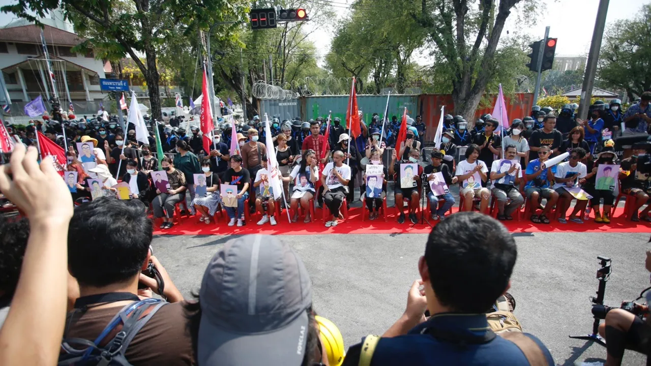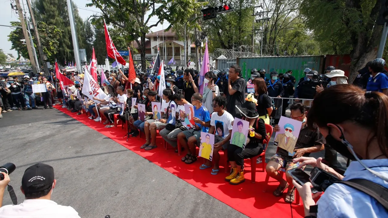 14.40 น. กลุ่มผู้ชุมนุมกิจกรรมหมู่บ้านทะลุฟ้า v3 เดินทางมารวมตัวกันตั้งแถวบริเวณสี่แยกนางเลิ้ง ก่อนเคลื่อนขบวนมาเชิงสะพานชมัยมรุเชฐ ฝั่งอนุสาวรีย์กรมหลวงชุมพร โดยมีการนำเก้าอี้ และพรมแดงมาวาง แล้วให้ผู้ที่ถูกจับกุมระหว่างถูกสลายการชุมนุมมานั่งเลียนแบบการถ่ายรูปคณะรัฐมนตรีใหม่ในทำเนียบ ซึ่งทางกลุ่มได้พร้อมกันตะโกนประกาศจุดยืน คือ ปล่อยเพื่อนเรา เขียนรัฐธรรมนูญใหม่ ยกเลิกม. 112 และพลเอกประยุทธ์ออกไป