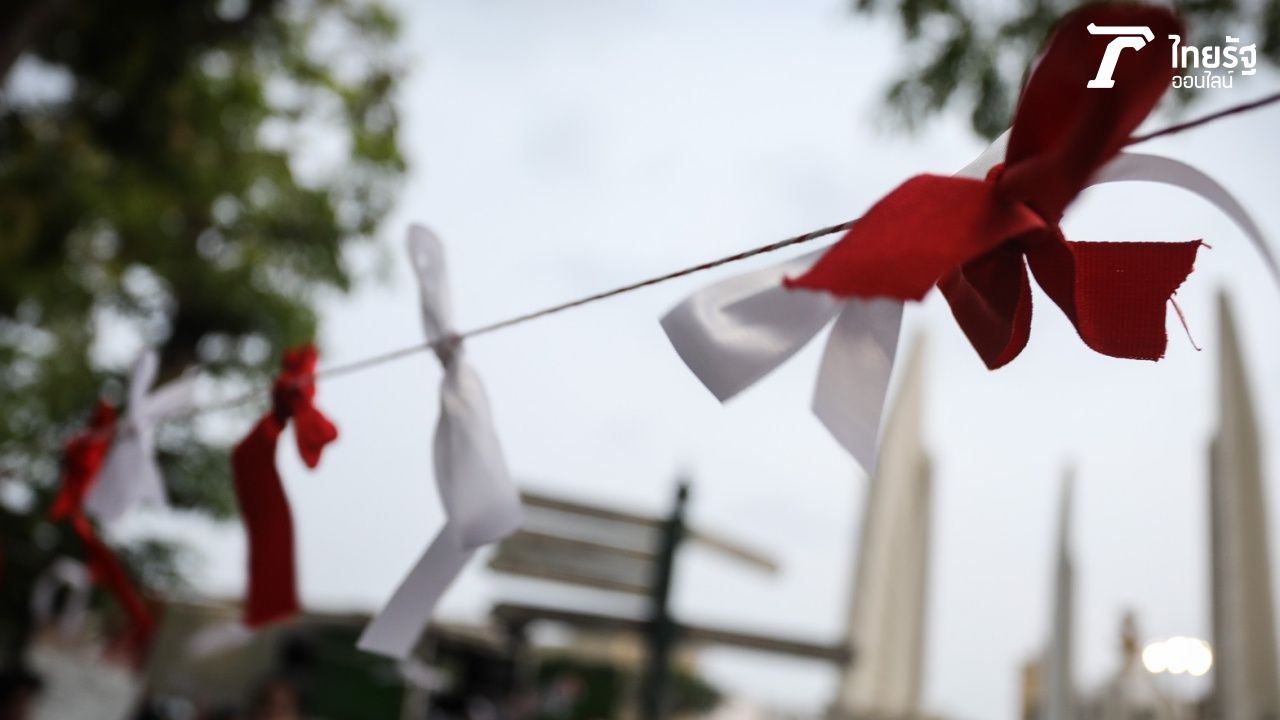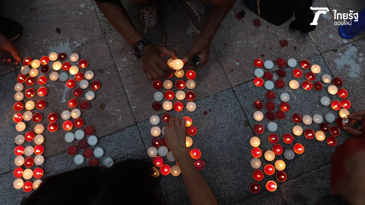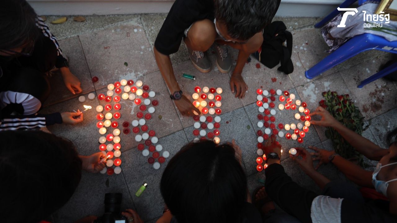 ขณะที่บริเวณฝั่งร้านแมคโดนัลด์ กลุ่มรามคำแหงเพื่อประชาธิปไตย ทำกิจกรรม รำลึกถึงวีรชนที่เสียสละชีวิต 10 เม.ย. 2553 ด้วยการจุดเทียนแดง พร้อมป้ายผ้า มาเขียนข้อความ และติดริบบิ้นสีแดงและเคารพธงชาติร่วมกัน