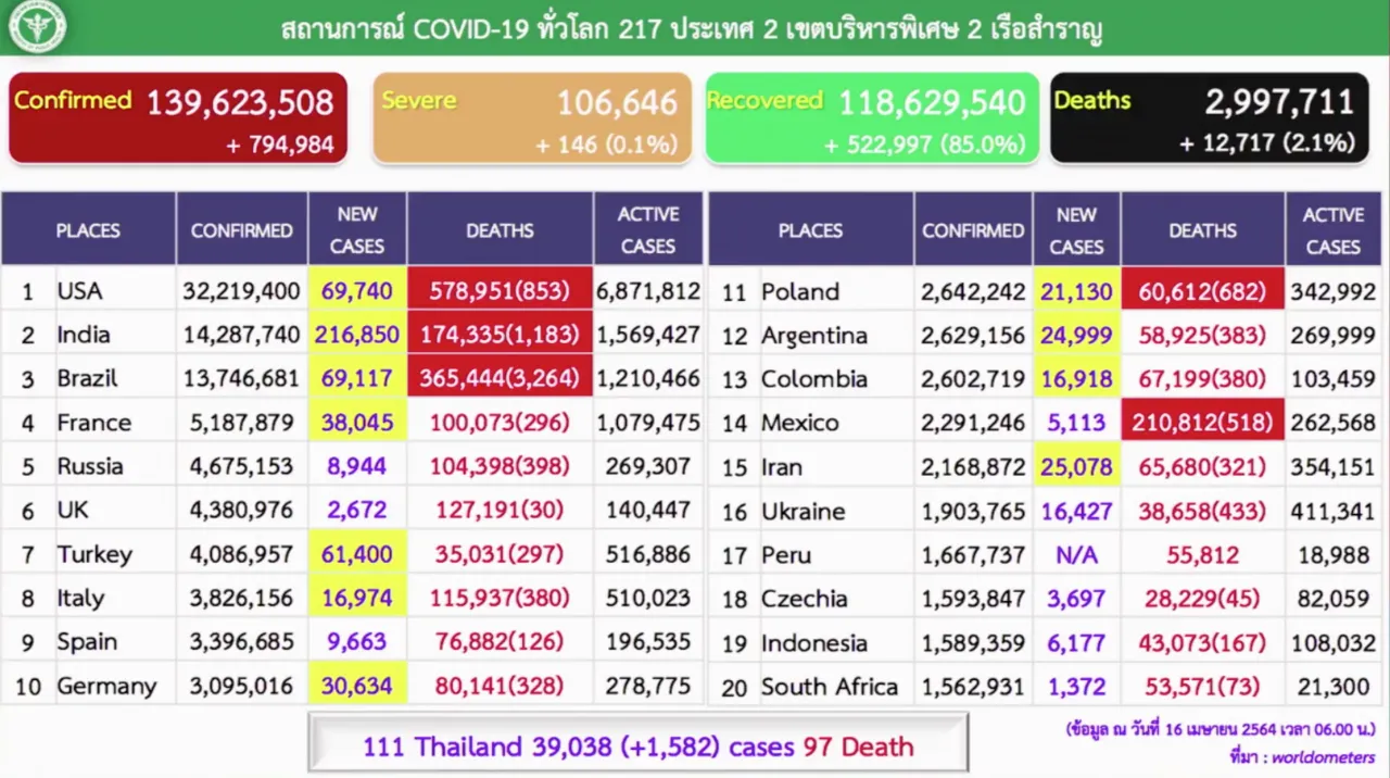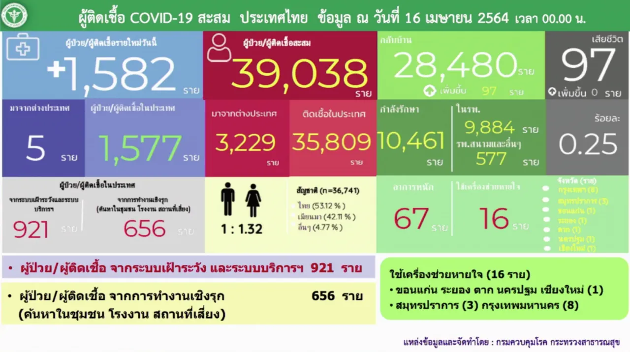 สถานการณ์โควิดวันนี้ 16 เม.ย. 64 ติดเชื้อใหม่ยังตัวเลข 4 หลัก ผู้ป่วย 1,582 ราย ยอดยืนยันสะสมพุ่งไปที่ 39,038 ราย รักษาหายอีก 97 ราย