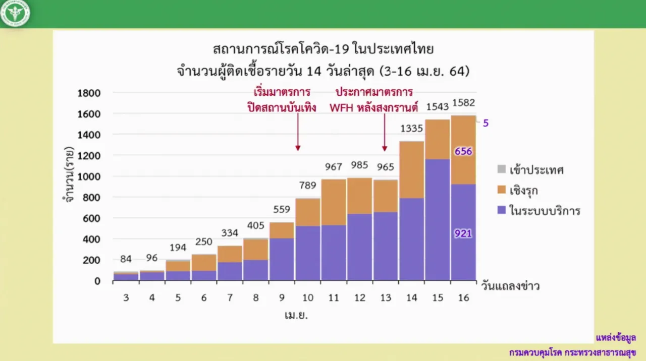 เมื่อเวลา 11.30 น. วันที่ 16 เม.ย. 2564 นพ.เฉวตสรร นามวาท รักษาราชการแทนผู้อำนวยการกองควบคุมโรคและภัยสุขภาพในภาวะฉุกเฉิน กรมควบคุมโรค แถลงข่าวที่กระทรวงสาธารณสุข รายงานสถานการณ์ผู้ติดเชื้อโควิด-19 ในประเทศไทย ในช่วงเทศกาลสงกรานต์ มีรายละเอียดดังนี้