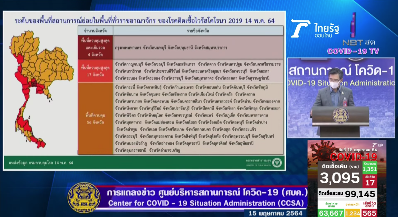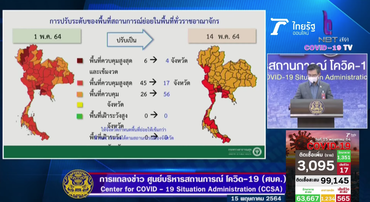 เมื่อเวลา 12.30 น. วันที่ 15 พ.ค. 2564 นายแพทย์ทวีศิลป์ วิษณุโยธิน โฆษกศูนย์บริหารสถานการณ์การแพร่ระบาดของโรคติดเชื้อไวรัสโคโรนา 2019 (โควิด-19) หรือ ศบค. แถลงข่าวถึงมาตรการผ่อนคลายร้านอาหาร โดยวานนี้ (14 พ.ค.) มีการระบุ 3 พื้นที่โซนสี ที่มีการผ่อนคลายให้ทานอาหารได้ร้านได้ แต่งดจำหน่ายและดื่มสุราในร้านนั้น ล่าสุด วันนี้ที่ประชุมศูนย์ปฏิบัติการ ศูนย์บริหารสถานการณ์โควิด-19 (ศปก.ศบค.) ได้กำหนดพื้นที่ว่าจังหวัดใดอยู่โซนสีใดแล้วเป็นดังนี้