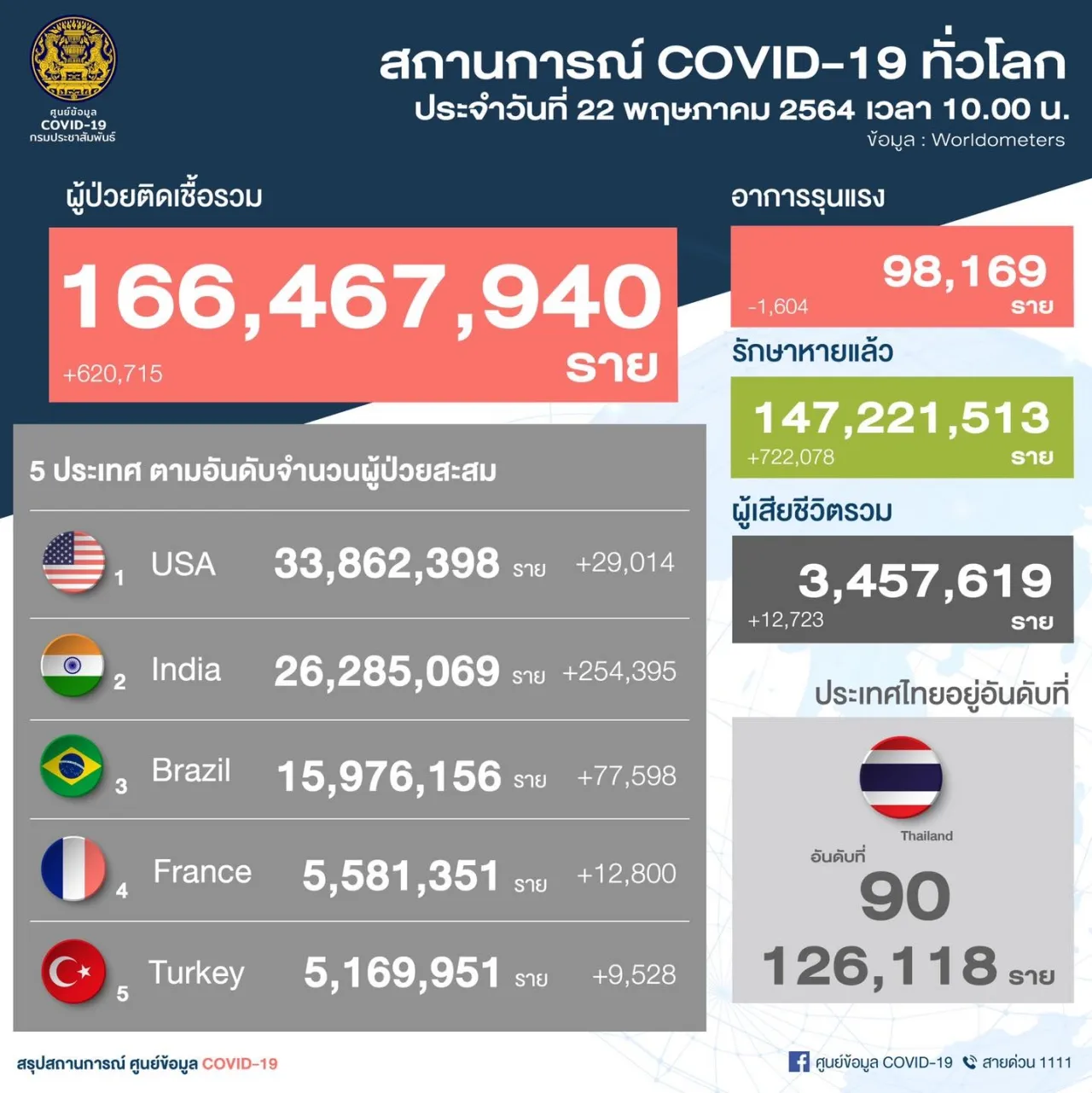 เมื่อเวลา 12.30 น. วันที่ 22 พ.ค. 2564 นายแพทย์ทวีศิลป์ วิษณุโยธิน โฆษกศูนย์บริหารสถานการณ์การแพร่ระบาดของโรคติดเชื้อไวรัสโคโรนา 2019 (โควิด-19) หรือ ศบค. แถลงข่าวจากทำเนียบรัฐบาล รายงานสถานการณ์ผู้ติดเชื้อโควิด-19 ในประเทศไทยมีรายละเอียดดังนี้