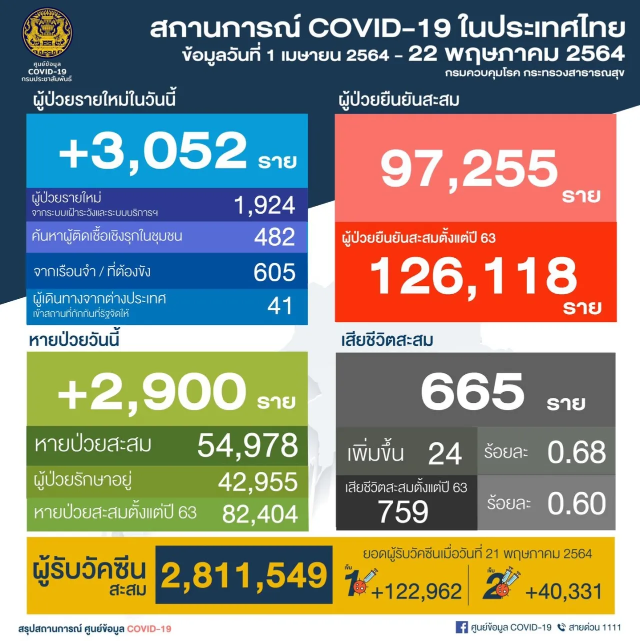 โฆษก ศบค. แถลงสถานการณ์โควิดวันนี้ 22 พ.ค. 64 ผู้ติดเชื้อยังสูง 3,052 รายใหม่ เสียชีวิตอีก 24 ศพ ยอดป่วยยืนยันสะสม 126,118 ราย ปอดอักเสบ 1,216 ราย รักษาหายอีก 2,900 ราย