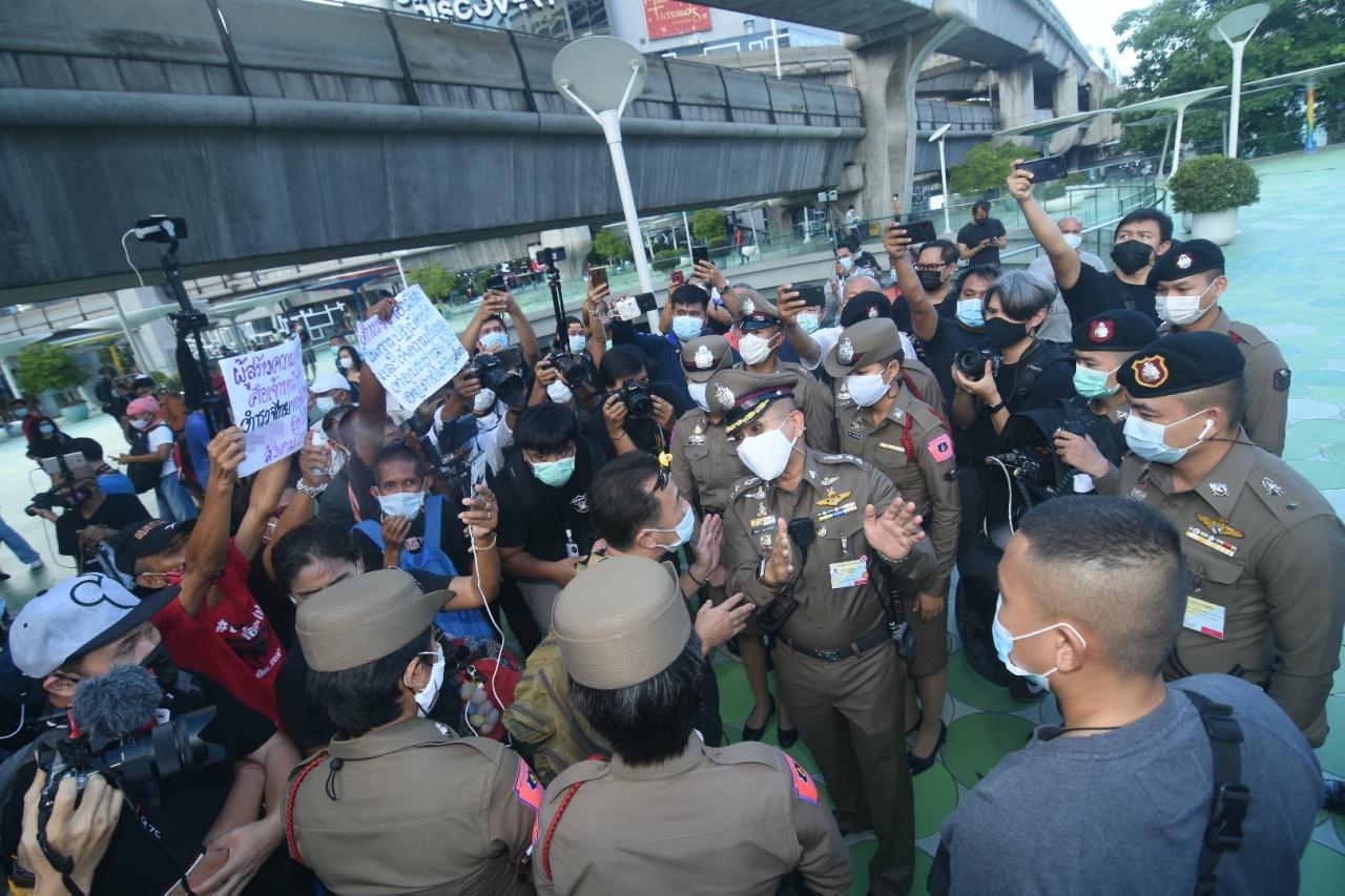 จากนั้น พ.ต.ท.ปิติพัฒน์ เอกอัครภูววัฒน์ รอง ผกก.ป.สน.ปทุมวัน ได้อ่านประกาศข้อกฎหมายให้ผู้ชุมนุมรับทราบเนื่องจากการรวมตัวกันในลักษณะนี้เป็นความผิดตาม พ.ร.ก.ฉุกเฉิน, พ.ร.บ.โรคติดต่อ ซึ่งระหว่างนั้นกลุ่มมวลชนได้ตะโกนด่าทอ ยกป้าย ชูสามนิ้วใส่เจ้าหน้าที่ด้วยความไม่พอใจ ภายหลัง พ.ต.ท.ปิติพัฒน์ ได้อ่านประกาศข้อกฎหมายเสร็จ ตัวแทนผู้ชุมนุมเข้าไปพูดคุยกับ พ.ต.อ.พันษา อมราพิทักษ์ ผกก.สน.ปทุมวัน และดำเนินกิจกรรมต่อไป