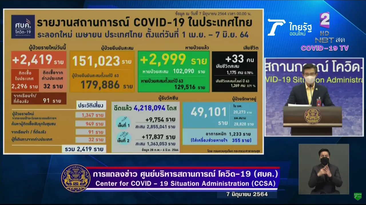 ศบค. แถลงสถานการณ์โควิดวันนี้ 7 มิ.ย. 64 ผู้ติดเชื้อ 2,419 รายใหม่ เสียชีวิตอีก 33 ศพ ยอดผู้ป่วยยืนยันสะสม 179,886 ราย อาการหนัก 1,233 ราย รักษาหายอีก 2,999 ราย