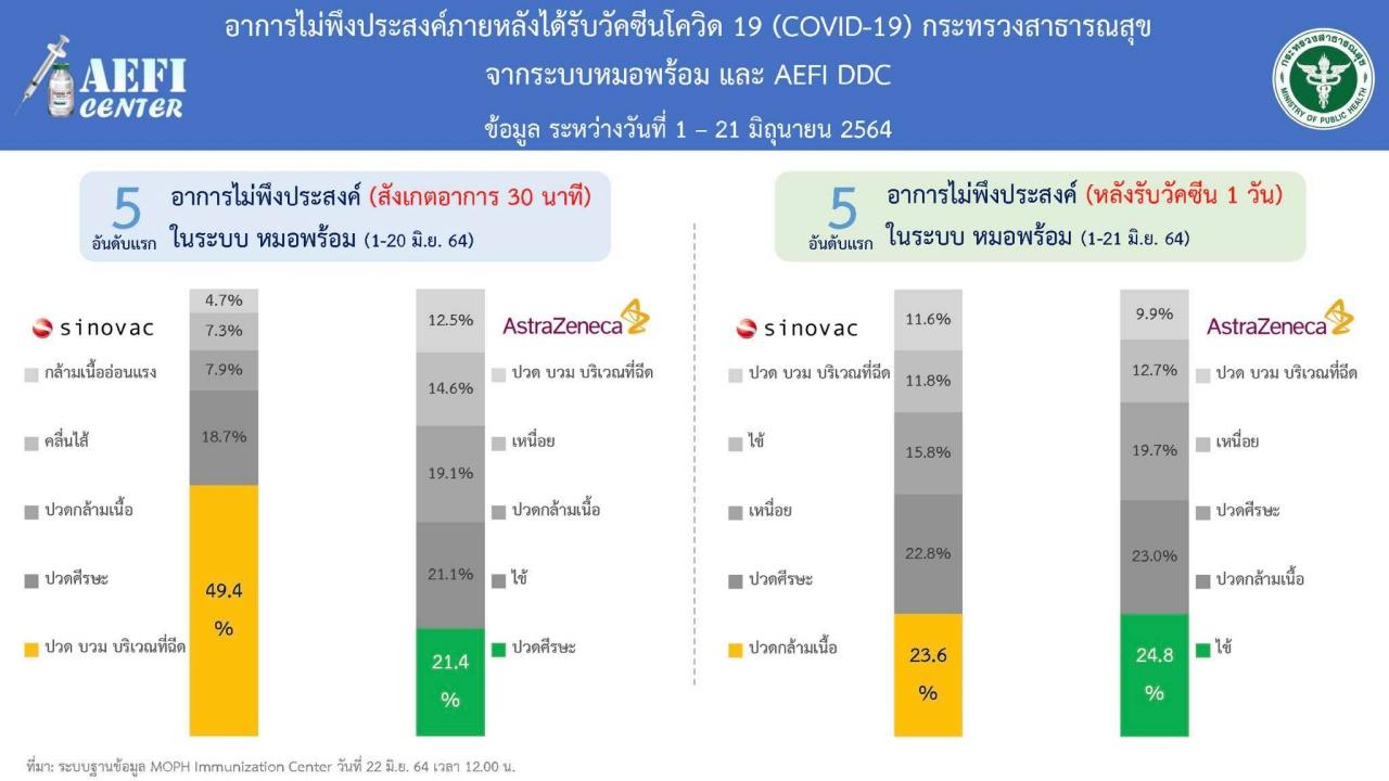 สำหรับอาการไม่พึงประสงค์หลังได้รับวัคซีนโควิด-19 ในวัคซีนแอสตราเซเนกา กับ วัคซีนซิโนแวค จากระบบหมอพร้อม และ AEFI DDC โดยเป็นข้อมูลระหว่างวันที่ 1 - 21 มิถุนายน 2564 มีรายละเอียด ดังนี้