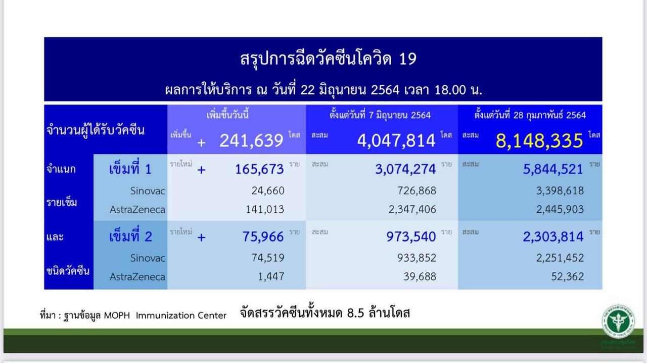 จำนวนผู้ได้รับวัคซีนวันที่ 22 มิ.ย. 2564 รวม 241,639 โดส