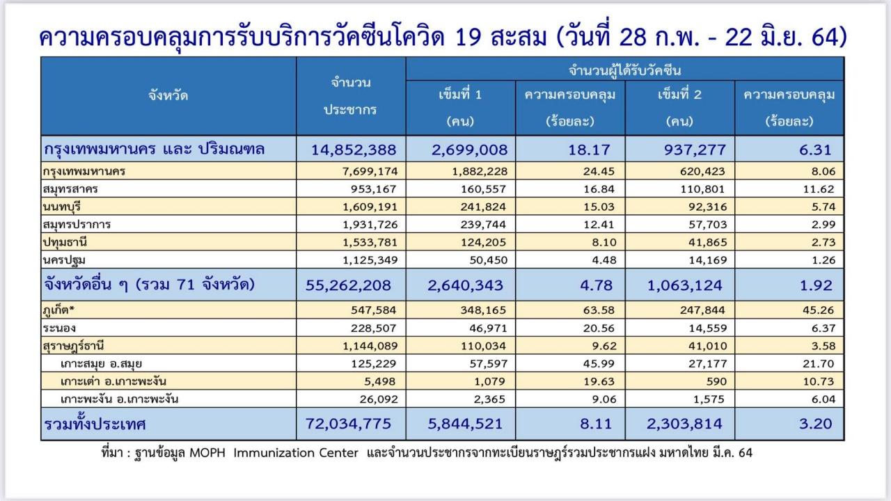 วันที่ 23 มิ.ย. 2564 นายแพทย์ทวีศิลป์ วิษณุโยธิน โฆษกศูนย์บริหารสถานการณ์การแพร่ระบาดของโรคติดเชื้อไวรัสโคโรนา 2019 (โควิด-19) หรือ ศบค. รายงานความคืบหน้าการฉีดวัคซีนโควิด-19 ในประเทศไทย ข้อมูล ณ วันที่ 22 มิ.ย. 2564 เวลา 18.00 น. ที่ผ่านมาเป็นดังนี้
