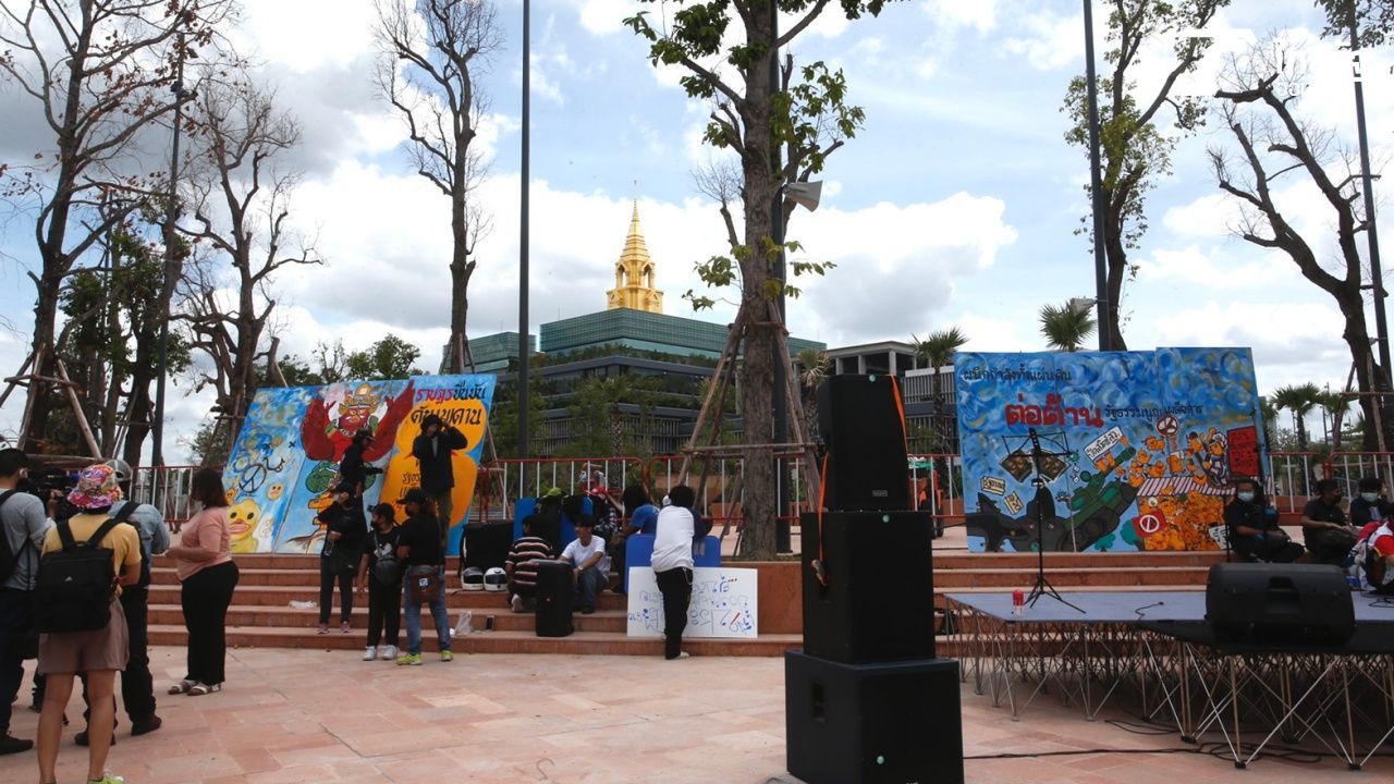 ม็อบราษฎร ตั้งเวที หน้ารัฐสภา แยกเกียกกาย เตรียมทำกิจกรรมเชิงสัญลักษณ์ เรียกร้องการแก้ไขรัฐธรรมนูญ ในวันครบรอบ 24 มิถุนา 2475 ท่ามกลางการรักษาความปลอดภัย จนท. ตำรวจอย่างเข้มงวด