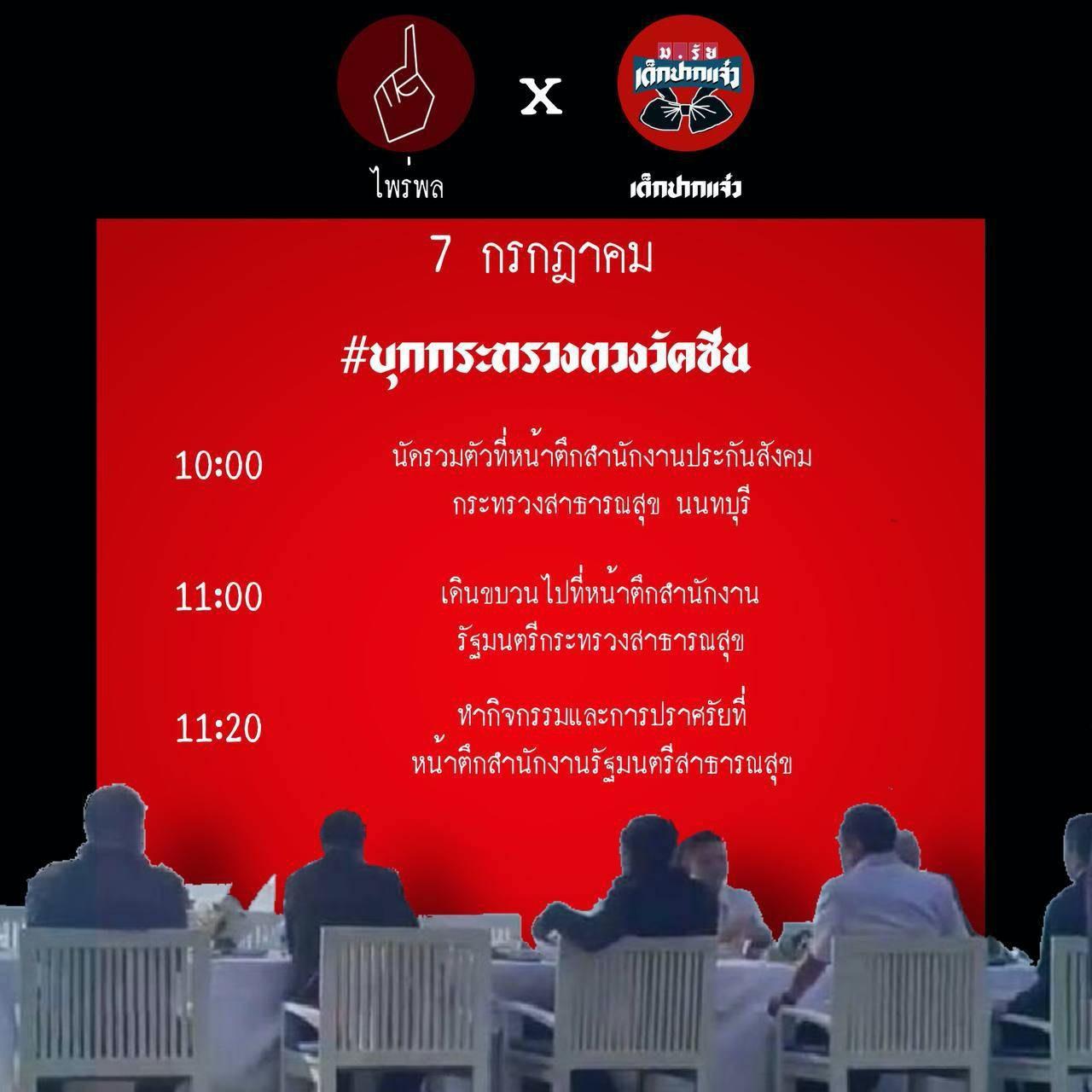 พร้อมสวมชุดดำ เพื่อไว้อาลัยผู้เสียชีวิต จากโควิด-19 กว่า 2,200 พันราย พร้อมยื่นข้อเรียกร้องต่อนายอนุทิน ชาญวีรกูล รองนายกรัฐมนตรีและรัฐมนตรีสาธารณสุข และ พล.อ.ประยุทธ์ จันทร์โอชา ในฐานะ ผอ.ศบค.