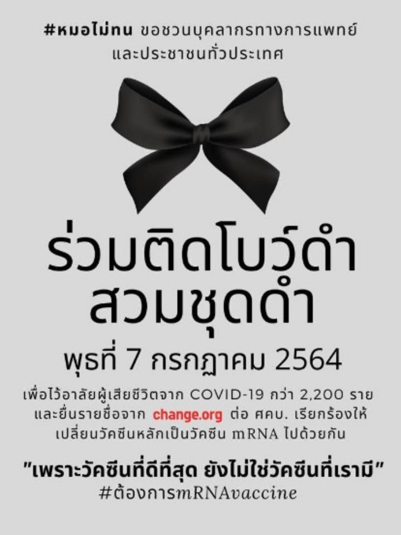 วันที่ 7 ก.ค. ผู้สื่อข่าวรายงานว่า วันนี้ กลุ่มหมอไม่ทน ขอชวนบุคลากรทางการแพทย์และประชาชนทั่วประเทศ ร่วมติดโบดำ ในวันพุธที่ 7 ก.ค.2564 เพื่อไว้อาลัยผู้เสียชีวิตจาก COVID-19 กว่า 2,200 ราย และยื่นรายชื่อจาก change.org ต่อ ศบค. เรียกร้องให้เปลี่ยนวัคซีนหลักเป็นวัคซีน mRNA ไปด้วยกัน "เพราะวัคซีนที่ดีที่สุด ยังไม่ใช่วัคซีนที่เรามี"#ต้องการmRNAvaccine