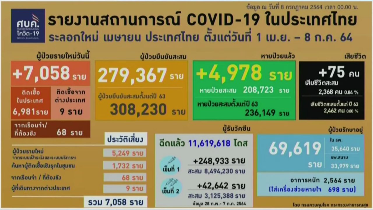 ศบค. รายงานสถานการณ์โควิดวันนี้ 8 ก.ค. 64 ตัวเลขผู้ติดเชื้อ 7,058 รายใหม่ เสียชีวิตอีก 75 ศพ ยอดป่วยยืนยันสะสม 236,149 ราย อาการหนัก 2,564 ราย หายป่วยเพิ่มอีก 4,978 ราย