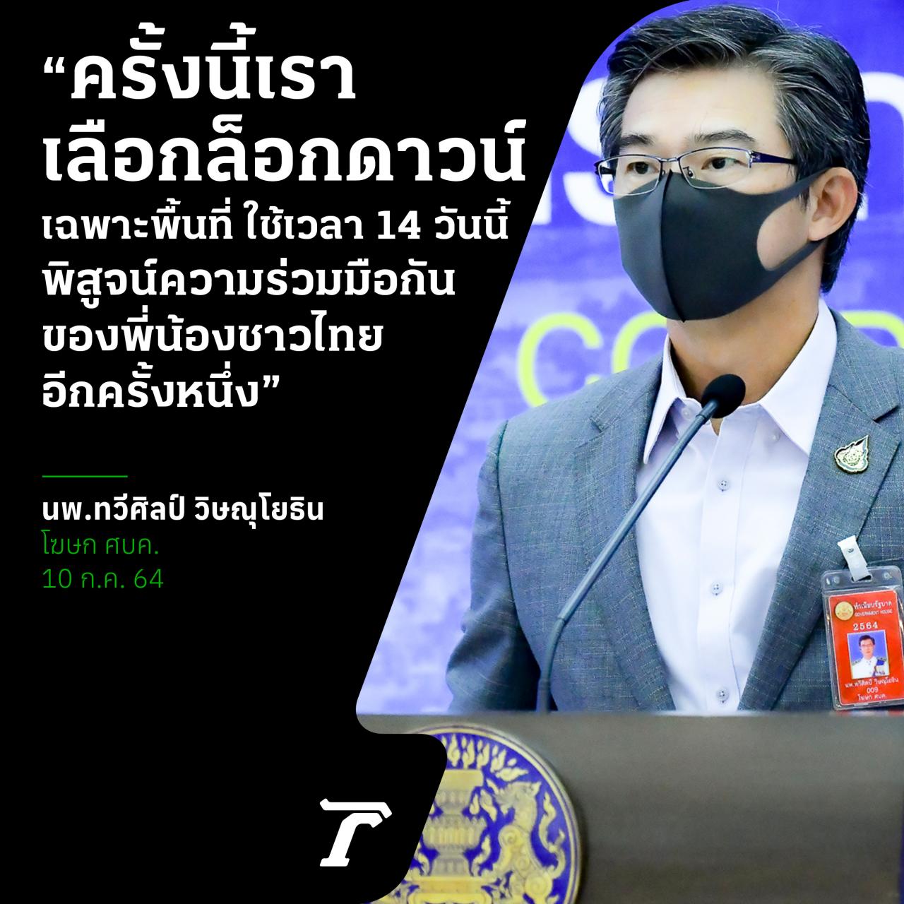 วันที่ 10 ก.ค. 2564 นายแพทย์ทวีศิลป์ วิษณุโยธิน โฆษกศูนย์บริหารสถานการณ์การแพร่ระบาดของโรคติดเชื้อไวรัสโคโรนา 2019 (โควิด-19) หรือ ศบค. แถลงข่าวที่ทำเนียบรัฐบาล ภายหลังกล่าวถึงการล็อกดาวน์และเคอร์ฟิว รวมถึงมาตรการต่างๆ ที่จะใช้ในการควบคุมสถานการณ์การระบาดของโควิด-19 ของ 10 จังหวัดพื้นที่ควบคุมสูงสุดและเข้มงวด หรือพื้นที่สีแดงเข้ม อย่าง กทม. ปริมณฑล และ 4 จังหวัดภาคใต้ เป็นเวลาอย่างน้อย 14 วัน เริ่มตั้งแต่วันที่ 12 ก.ค.-25 ก.ค. 2564