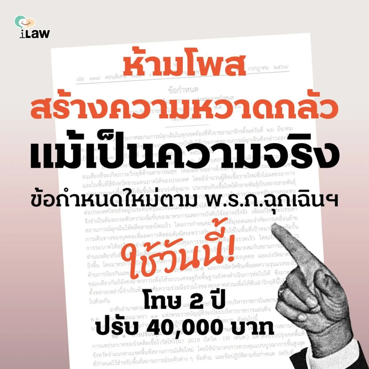 “ไอลอว์” เตือน ข้อกำหนดใหม่ตาม พ.ร.ก.ฉุกเฉินฯ เริ่มใช้วันนี้ ห้ามโพสต์สร้างความหวาดกลัว แม้เป็นความจริงก็ผิด โทษจำคุก 2 ปี ปรับหนัก 40,000 บาท