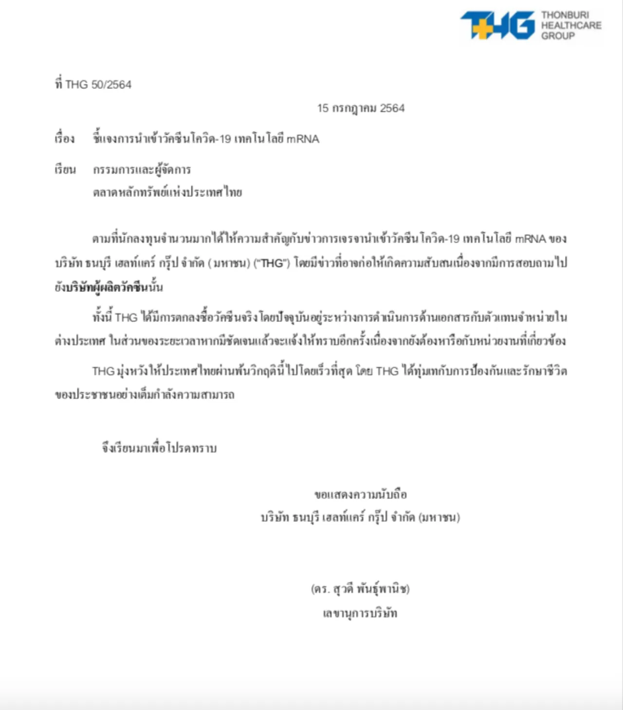ทั้งนี้ ผู้สื่อข่าวรายงานว่า ทางบริษัท ธนบุรี เฮลท์แคร์ กรุ๊ป จำกัด (มหาชน) ได้ทำหนังสือ ชี้แจงเรื่องการนำเข้าวัคซีนโควิด-19 เทคโนโลยี mRNA ให้กับทางกรรมการและผู้จัดการตลาดหลักทรัพย์แห่งประเทศไทย ลงวันที่ 15 ก.ค. 2564 โดยเนื้อหา ยืนยันว่า ทางบริษัทได้มีการตกลงซื้อวัคซีนจริง ซึ่งปัจจุบันอยู่ระหว่างการดำเนินการด้านเอกสารกับตัวแทนจำหน่ายในต่างประเทศ ในส่วนระยะเวลาหากมีความชัดเจนแล้วจะแจ้งให้ทราบอีกครั้ง