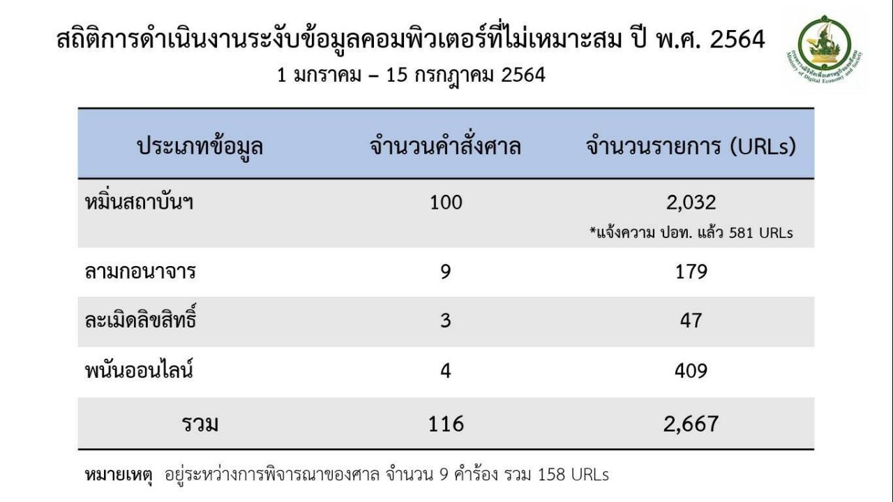 -เว็บลามกอนาจาร 9 คำสั่งศาล 179 รายการ การละเมิดลิขสิทธิ์ 3 คำสั่งศาล 47 รายการและเว็บพนันออนไลน์ 4 คำสั่ง 409 รายการ รวม 116 คำสั่งศาล 2,667 รายการ