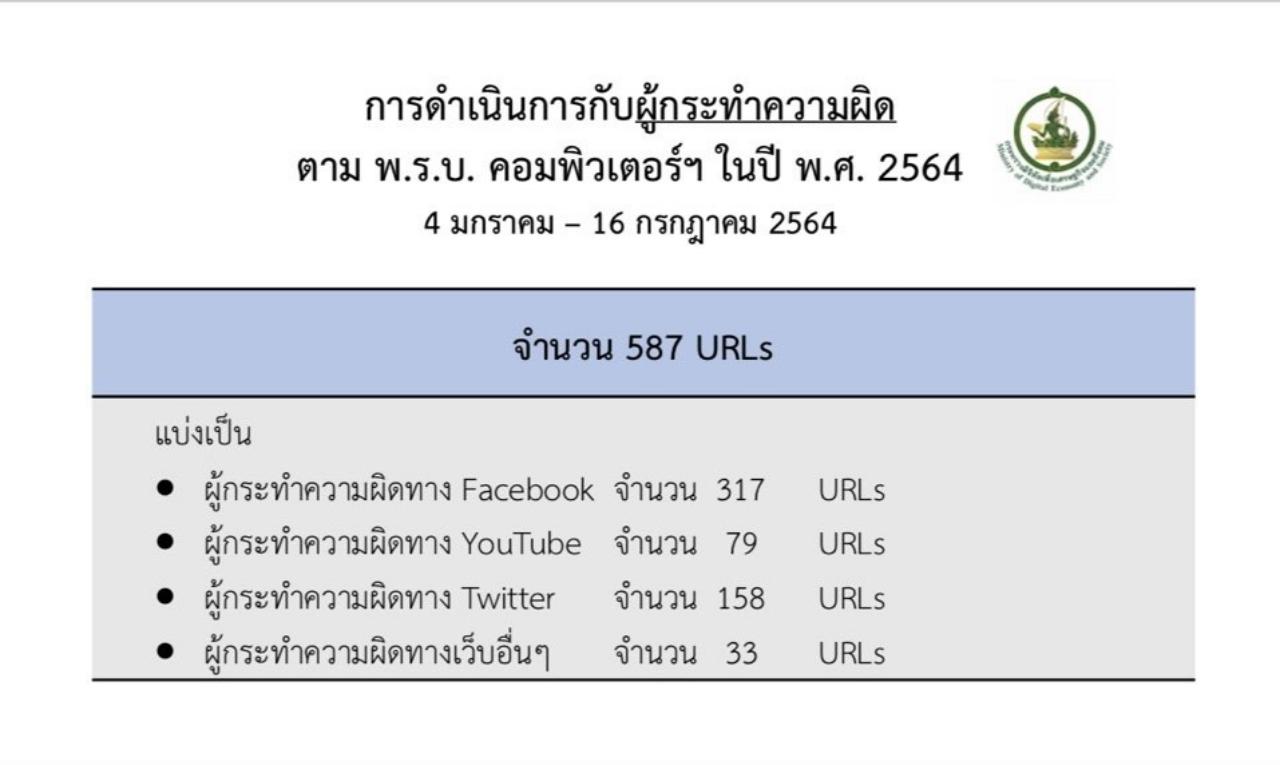 - กรณีหมิ่นสถาบันฯ จำนวน 100 คำสั่งศาล 2,032 รายการ (URLs) โดยได้ดำเนินการประสานแจ้งความ กับ ปอท. แล้ว 581 URLs
