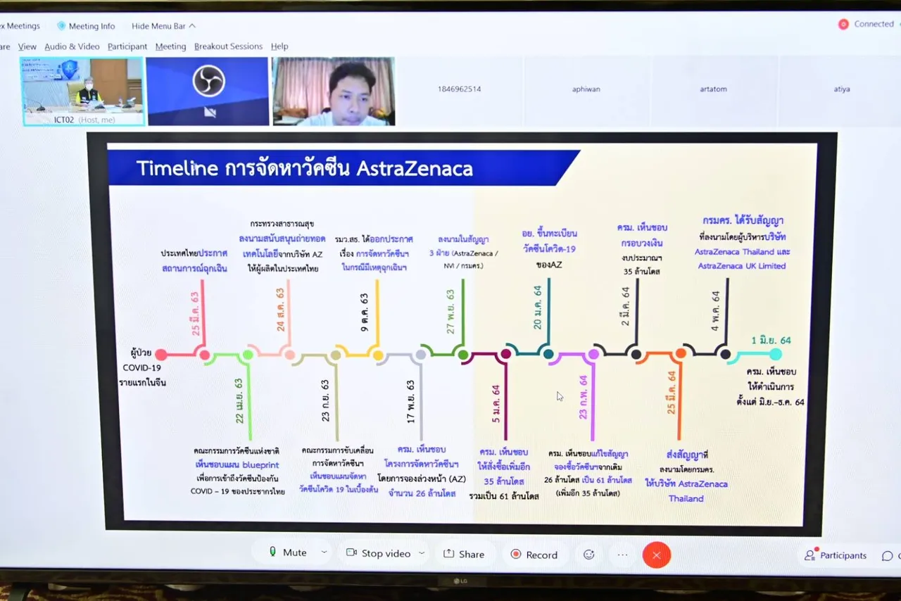 ต่อมาวันที่ 17 พฤศจิกายน 2563 ครม.เห็นชอบโครงการจัดหาวัคซีนโดยการจองล่วงหน้ากับแอสตร้าเซนเนก้า 26 ล้านโดส, วันที่ 27 พฤศจิกายน 2563 ลงนามในสัญญา 3 ฝ่าย โดยแอสตร้าเซนเนก้าประเทศไทย สถาบันวัคซีนแห่งชาติ และกรมควบคุมโรค เพื่อจองซื้อวัคซีน, วันที่ 5 มกราคม 2564 ครม.รับทราบ มติที่ ศบค. ให้สั่งซื้อเพิ่มอีก 35 ล้านโดส รวมเป็น 61 ล้านโดส, วันที่ 20 มกราคม 2564 สำนักงานคณะกรรมการอาหารและยา (อย.) ขึ้นทะเบียนวัคซีนแอสตราเซเนกาให้ใช้ได้ในภาวะฉุกเฉิน, วันที่ 23 กุมภาพันธ์ 2564 ครม.เห็นชอบแก้ไขสัญญาจองซื้อวัคซีนจาก 26 ล้านโดส เพิ่มอีก 35 ล้านโดส รวมเป็น 61 ล้านโดส, วันที่ 2 มีนาคม 2564 ครม.รับทราบ และอนุมัติกรอบวงเงินงบประมาณเพิ่มสำหรับ 35 ล้านโดส, วันที่ 25 มีนาคม 2564 กรมควบคุมโรคส่งสัญญาที่ลงนามแก้ไขให้บริษัทแอสตร้าเซนเนก้าประเทศไทย, วันที่ 4 พฤษภาคม 2564 ได้รับสัญญาตอบกลับจากแอสตร้าเซนเนก้าประเทศไทยและประเทศอังกฤษ หรือใช้เวลา 2 เดือนจึงได้รับการตอบกลับ และวันที่ 1 มิถุนายน 2564 ครม.เห็นชอบกรอบการดำเนินงาน 61 ล้านโดส ตั้งแต่เดือนมิถุนายน - ธันวาคม 2564